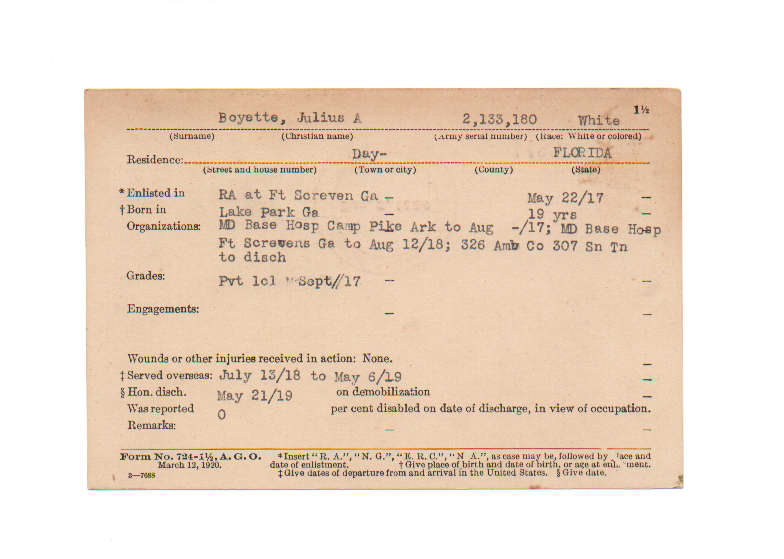 Florida. Military Dept. Julius A Boyette. . State Archives of Florida, Florida Memory. Accessed 25 Dec. 2025.<https://www.floridamemory.com/items/show/230872>