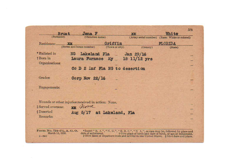 Florida. Military Dept. Jena F Brust. . State Archives of Florida, Florida Memory. Accessed 26 Jan. 2026.<https://www.floridamemory.com/items/show/231863>
