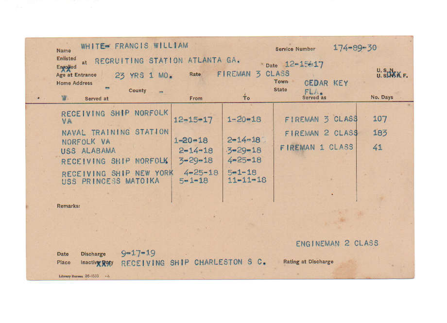 Florida. Military Dept. Francis William White. . State Archives of Florida, Florida Memory. Accessed 23 Dec. 2025.<https://www.floridamemory.com/items/show/232027>