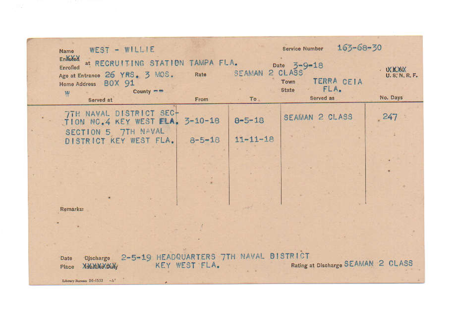 Florida. Military Dept. Willie West. . State Archives of Florida, Florida Memory. Accessed 26 Dec. 2025.<https://www.floridamemory.com/items/show/232068>