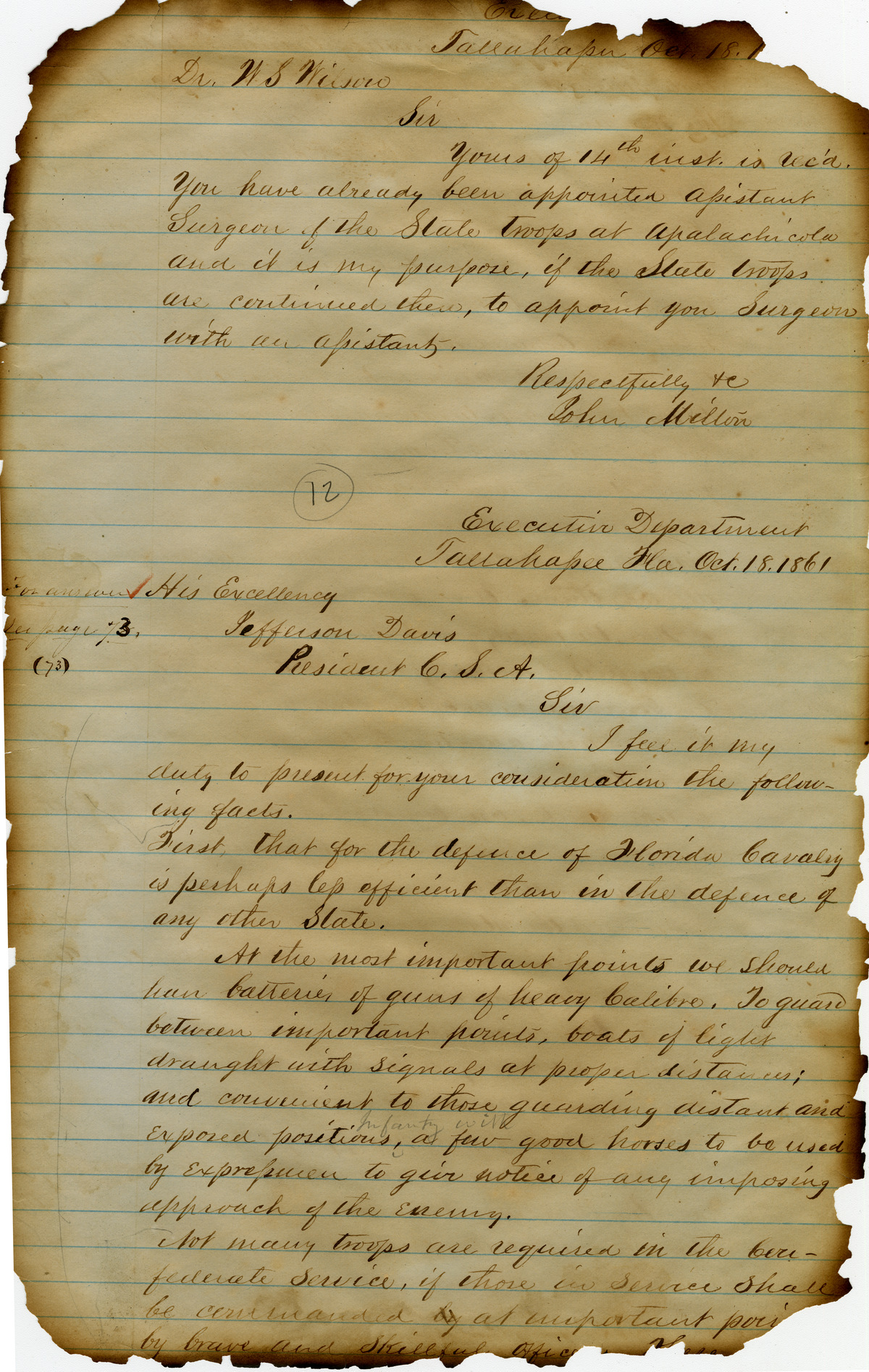 Office of the Governor of Florida. Milton Letterbook: October 18, 1861. 1861-10-18. State Archives of Florida, Florida Memory. Accessed 29 Nov. 2025.<https://www.floridamemory.com/items/show/265638>