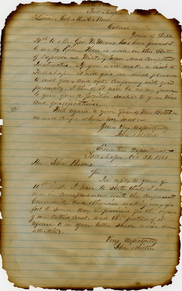 Office of the Governor of Florida. Milton Letterbook: October 21, 1861. 1861-10-21. State Archives of Florida, Florida Memory. <https://www.floridamemory.com/items/show/265646>, accessed 29 November 2025.