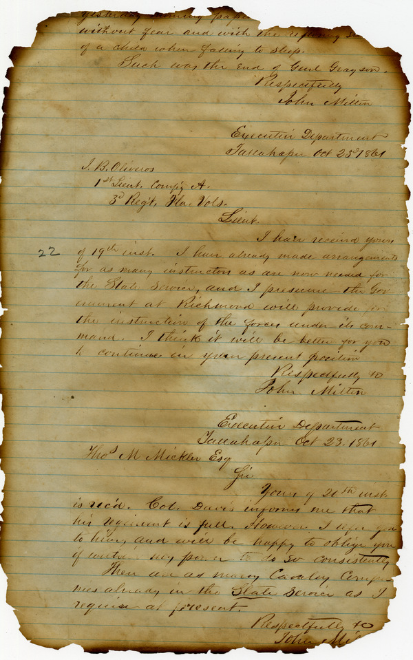 Office of the Governor of Florida. Milton Letterbook: October 22, 1861. 1861-10-23. State Archives of Florida, Florida Memory. <https://www.floridamemory.com/items/show/265648>, accessed 29 November 2025.
