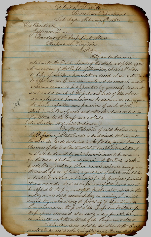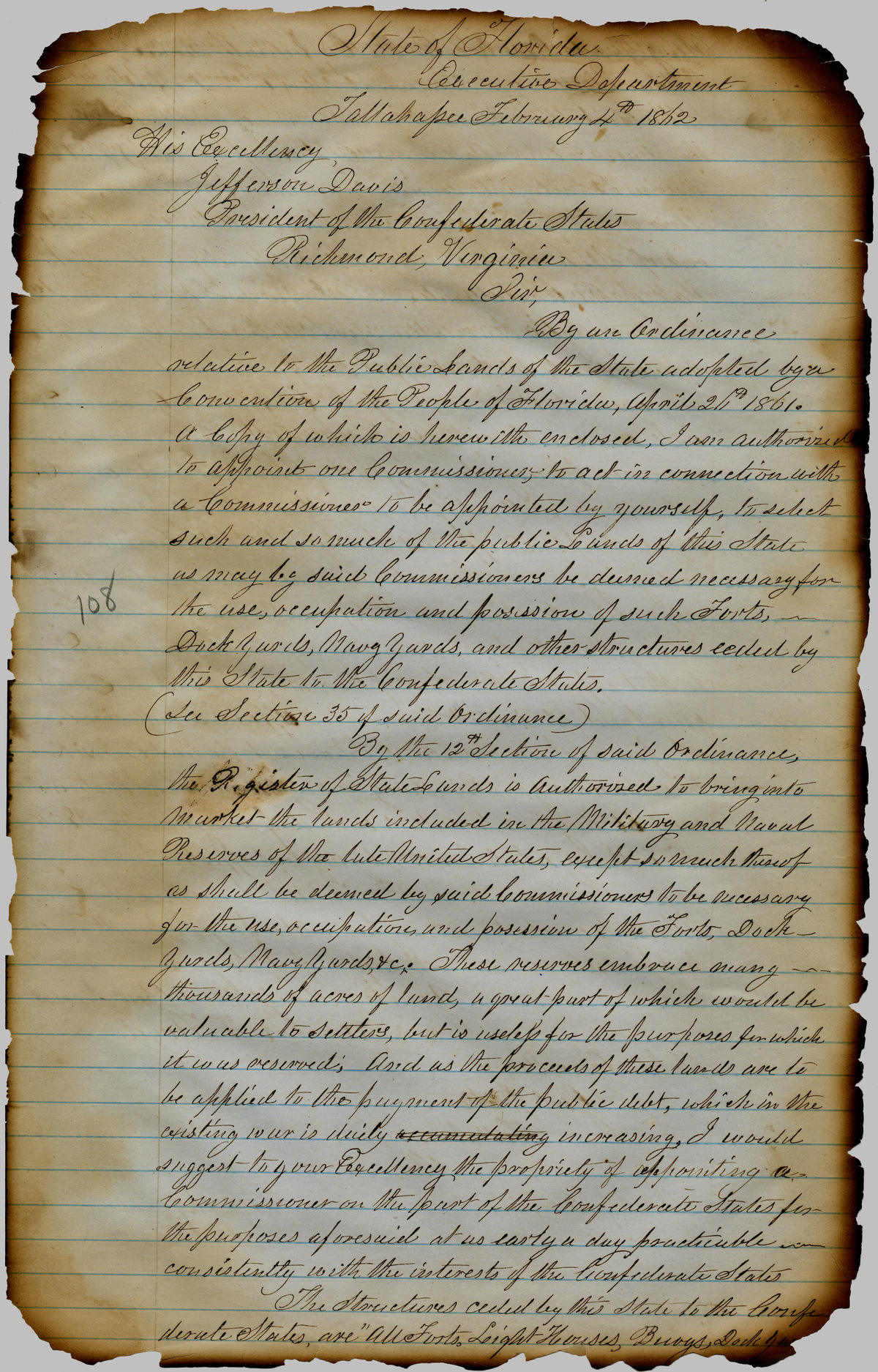 Office of the Governor of Florida. Milton Letterbook: February 4, 1862. 1861-04-21. State Archives of Florida, Florida Memory. Accessed 26 Nov. 2025.<https://www.floridamemory.com/items/show/265735>