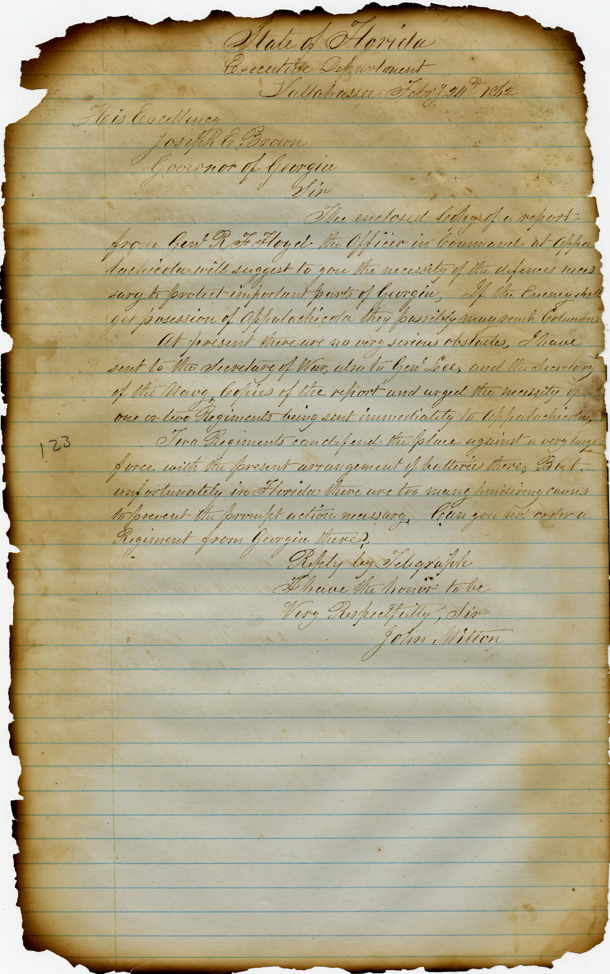 Office of the Governor of Florida. Milton Letterbook: February 20, 1862. 1862-02-20. State Archives of Florida, Florida Memory. Accessed 26 Nov. 2025.<https://www.floridamemory.com/items/show/265750>