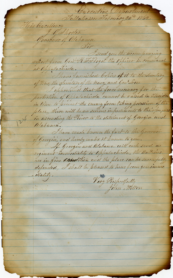 Office of the Governor of Florida. Milton Letterbook: February 20, 1862. 1862-02-20. State Archives of Florida, Florida Memory. Accessed 26 Nov. 2025.<https://www.floridamemory.com/items/show/265751>