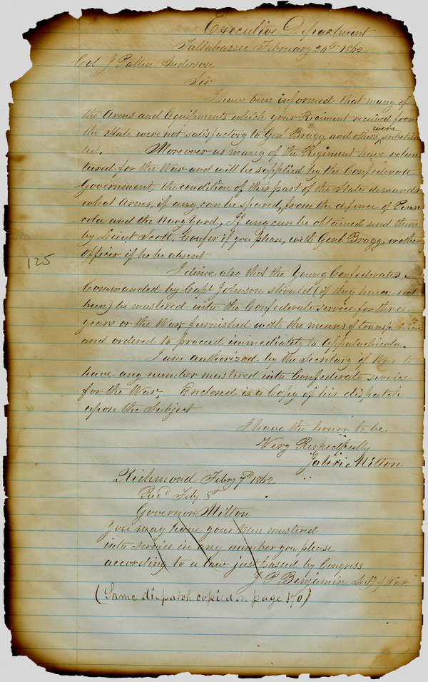 Office of the Governor of Florida. Milton Letterbook: February 20, 1862. 1862-02-20. State Archives of Florida, Florida Memory. Accessed 26 Nov. 2025.<https://www.floridamemory.com/items/show/265752>