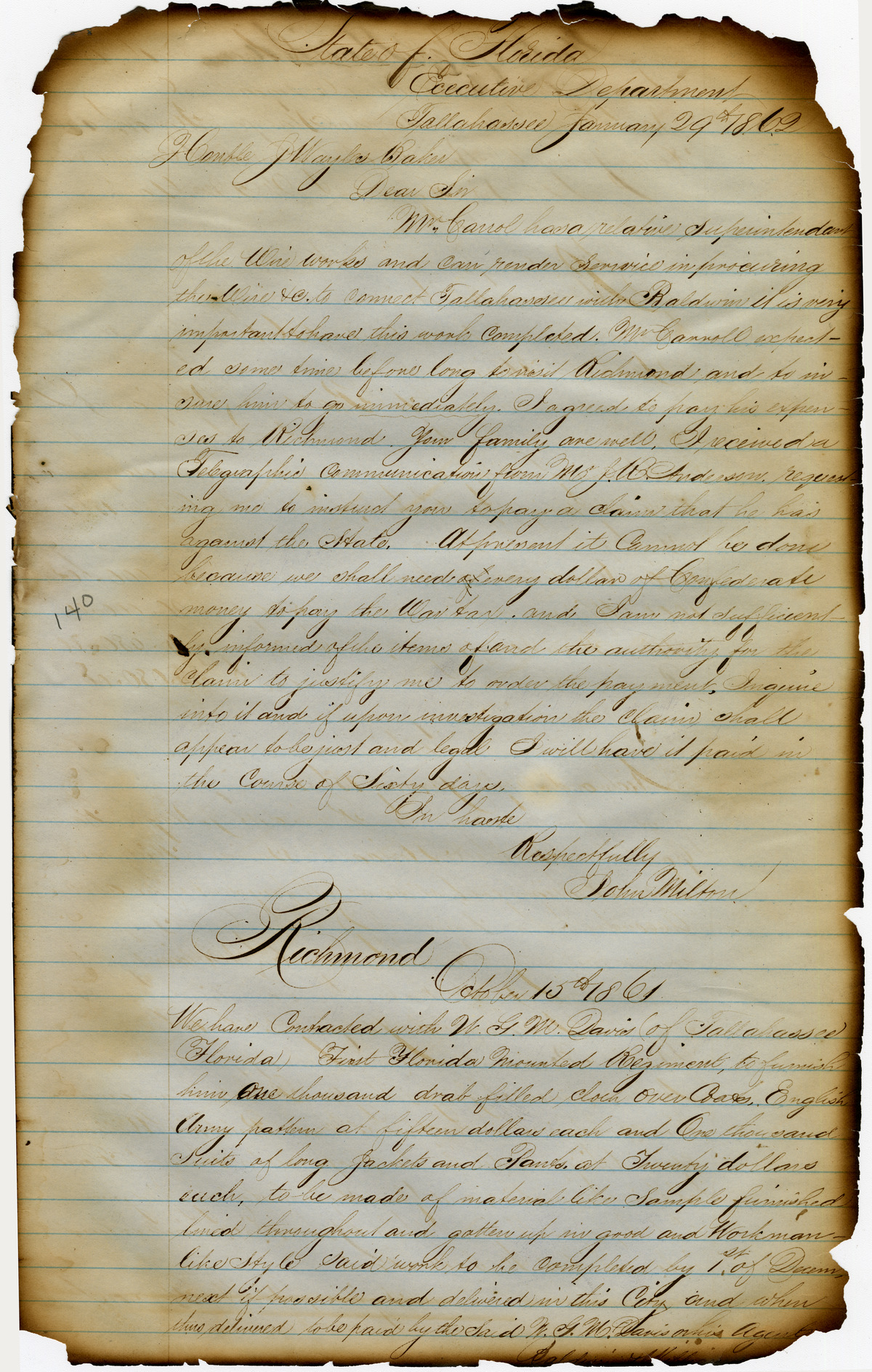 Office of the Governor of Florida. Milton Letterbook: January 29, 1862. 1861-10-15. State Archives of Florida, Florida Memory. <https://www.floridamemory.com/items/show/265767>, accessed 26 November 2025.