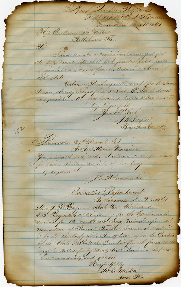 Office of the Governor of Florida. Milton Letterbook: December 11, 1861. 1861-12-24. State Archives of Florida, Florida Memory. Accessed 25 Nov. 2025.<https://www.floridamemory.com/items/show/265779>