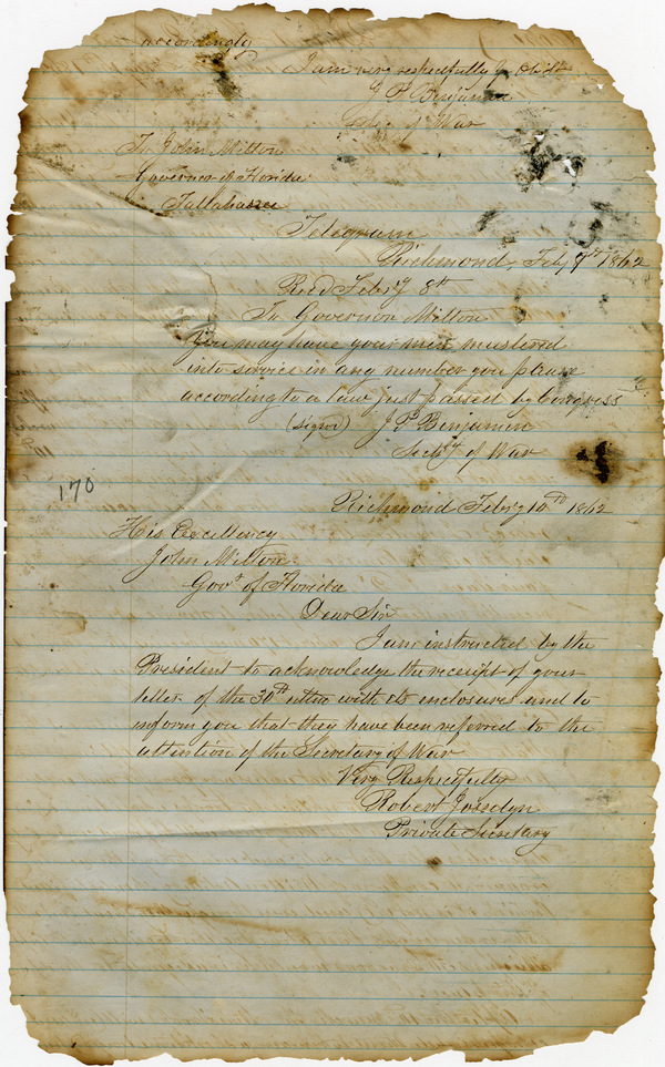 Office of the Governor of Florida. Milton Letterbook: January 1862. 1862-02-11. State Archives of Florida, Florida Memory. <https://www.floridamemory.com/items/show/265797>, accessed 25 November 2025.