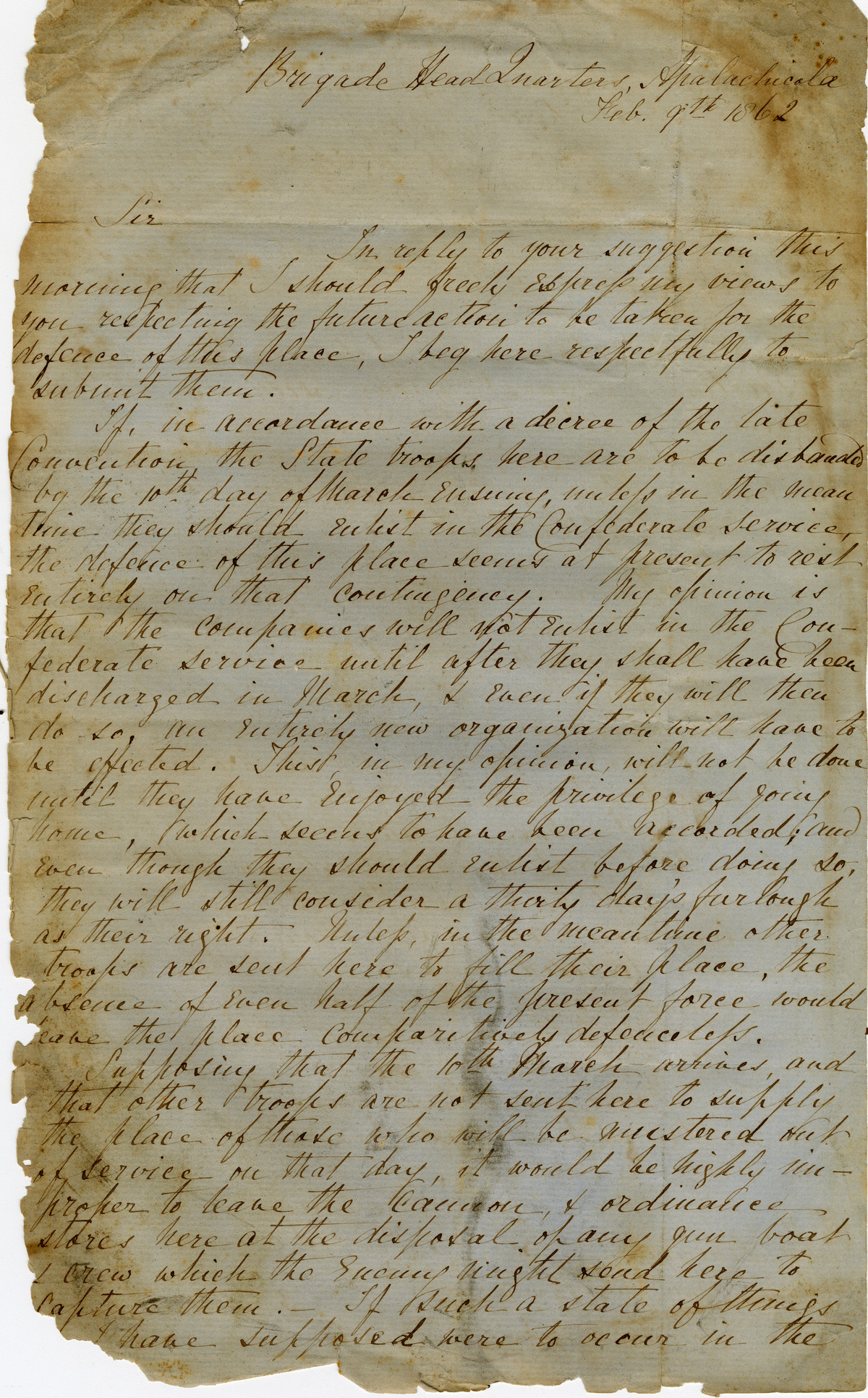 Office of the Governor of Florida. Milton Letterbook: February 9, 1862. 1862-02-09. State Archives of Florida, Florida Memory. Accessed 25 Nov. 2025.<https://www.floridamemory.com/items/show/265799>