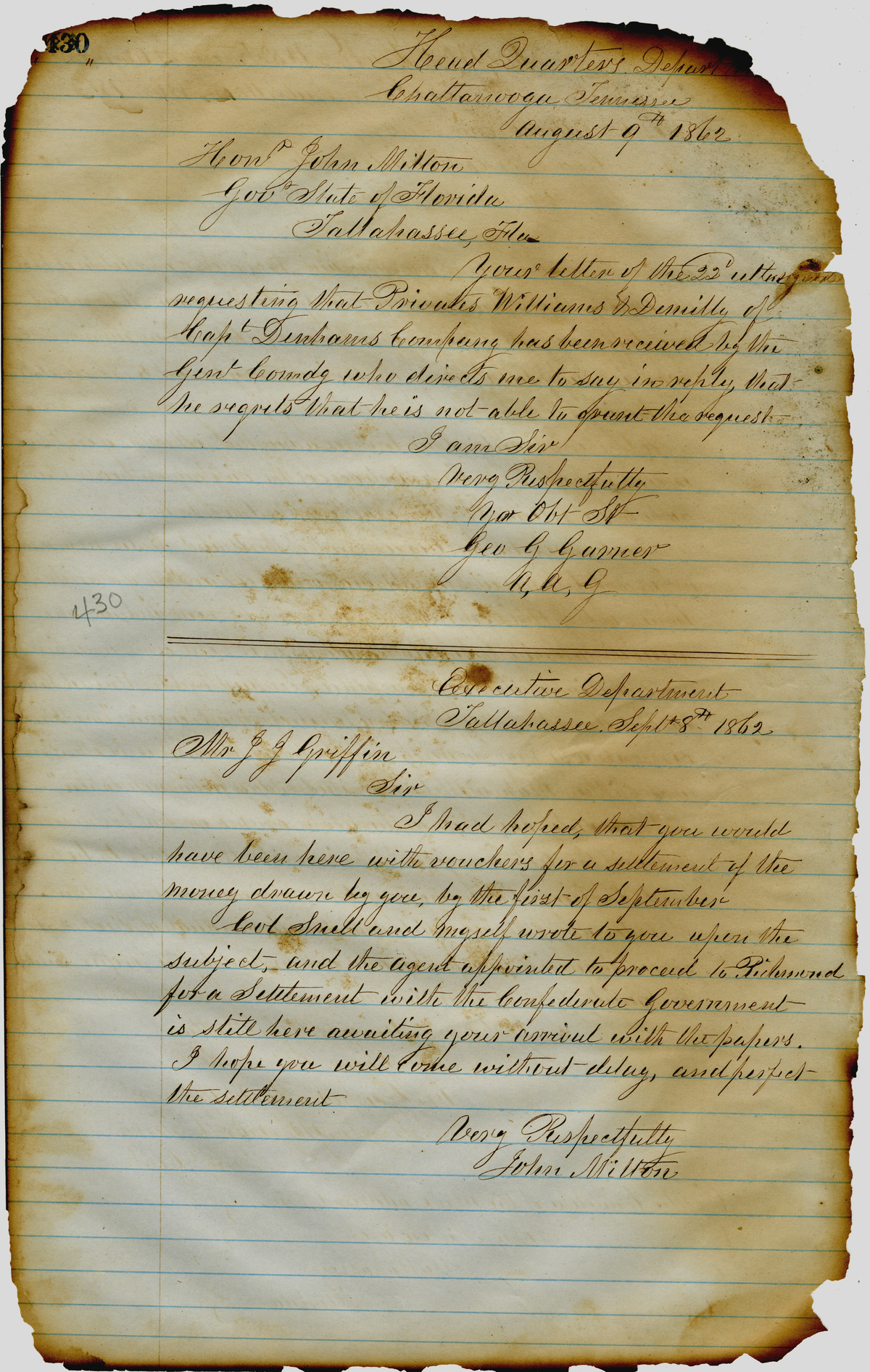 Office of the Governor of Florida. Milton Letterbook: August 9, 1862. 1862-09-08. State Archives of Florida, Florida Memory. Accessed 25 Nov. 2025.<https://www.floridamemory.com/items/show/266036>