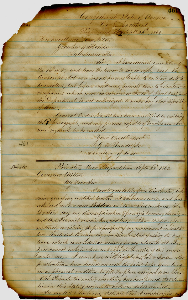 Office of the Governor of Florida. Milton Letterbook: September 26, 1862. 1862-09-22. State Archives of Florida, Florida Memory. <https://www.floridamemory.com/items/show/266067>, accessed 26 November 2025.