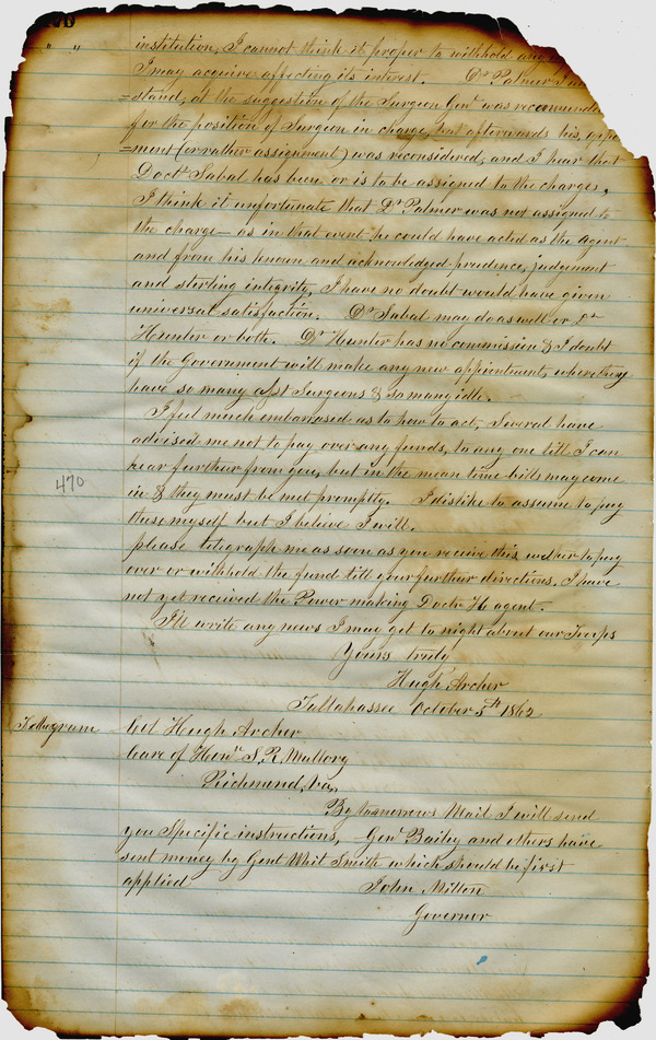 Office of the Governor of Florida. Milton Letterbook: September 25, 1862. 1862-10-05. State Archives of Florida, Florida Memory. Accessed 26 Nov. 2025.<https://www.floridamemory.com/items/show/266076>