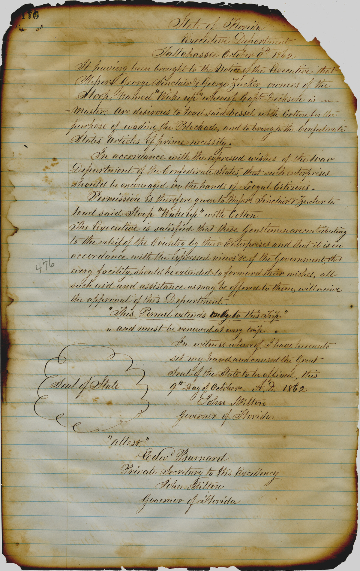 Office of the Governor of Florida. Milton Letterbook: October 9, 1862. 1862-10-09. State Archives of Florida, Florida Memory. Accessed 26 Nov. 2025.<https://www.floridamemory.com/items/show/266082>