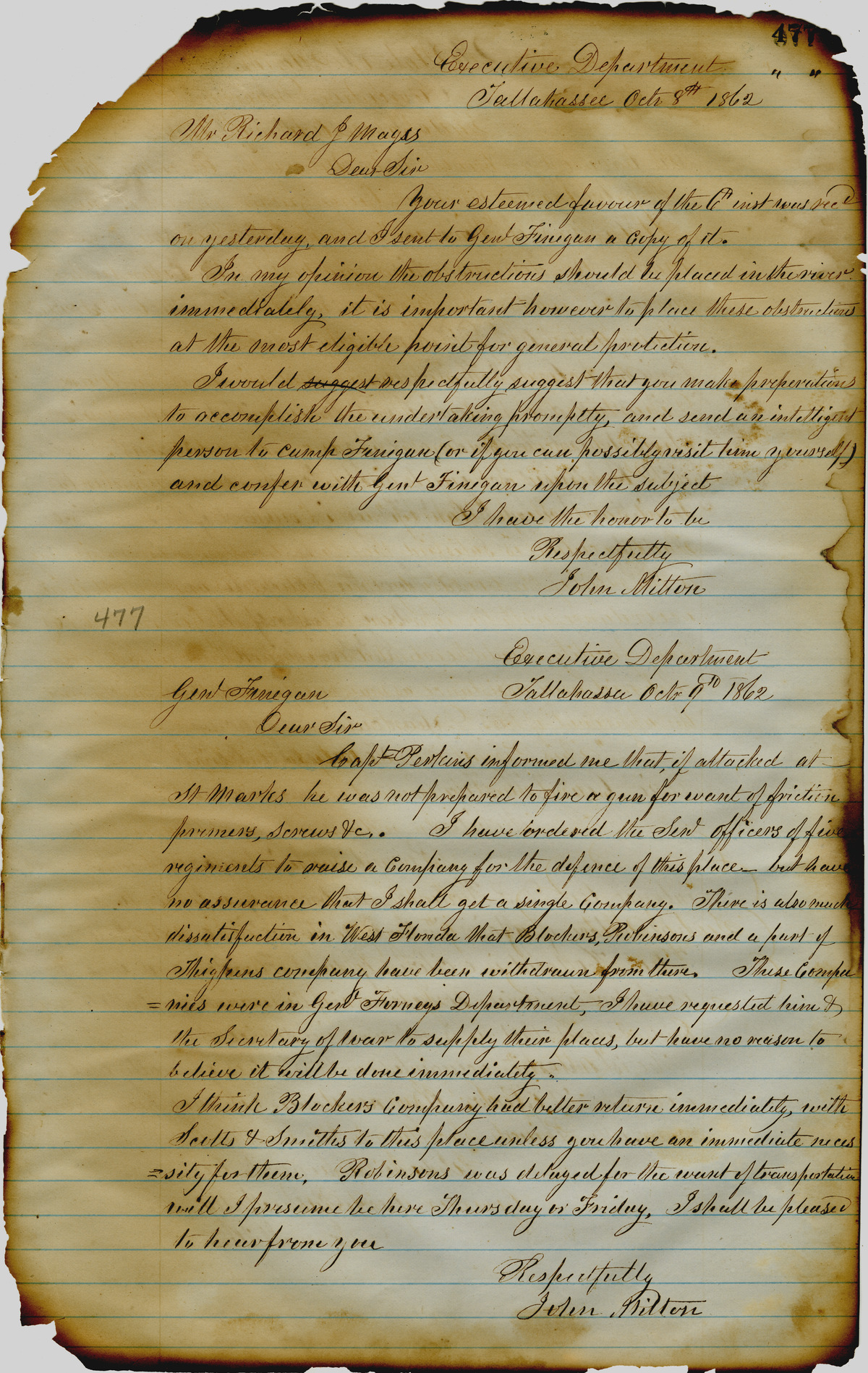 Office of the Governor of Florida. Milton Letterbook: October 8, 1862. 1862-10-08. State Archives of Florida, Florida Memory. <https://www.floridamemory.com/items/show/266083>, accessed 26 November 2025.