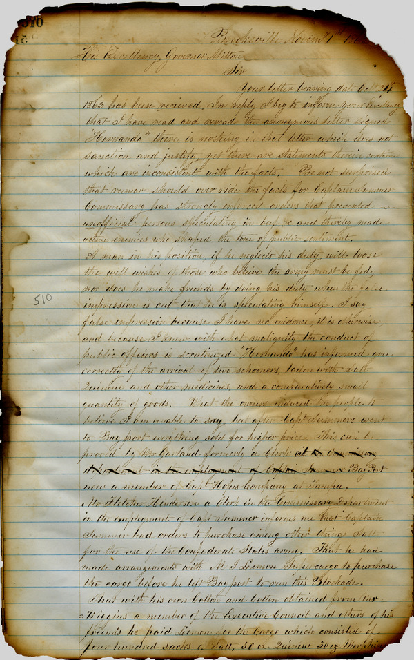 Office of the Governor of Florida. Milton Letterbook: November 1, 1862. 1862-11-01. State Archives of Florida, Florida Memory. Accessed 27 Nov. 2025.<https://www.floridamemory.com/items/show/266116>