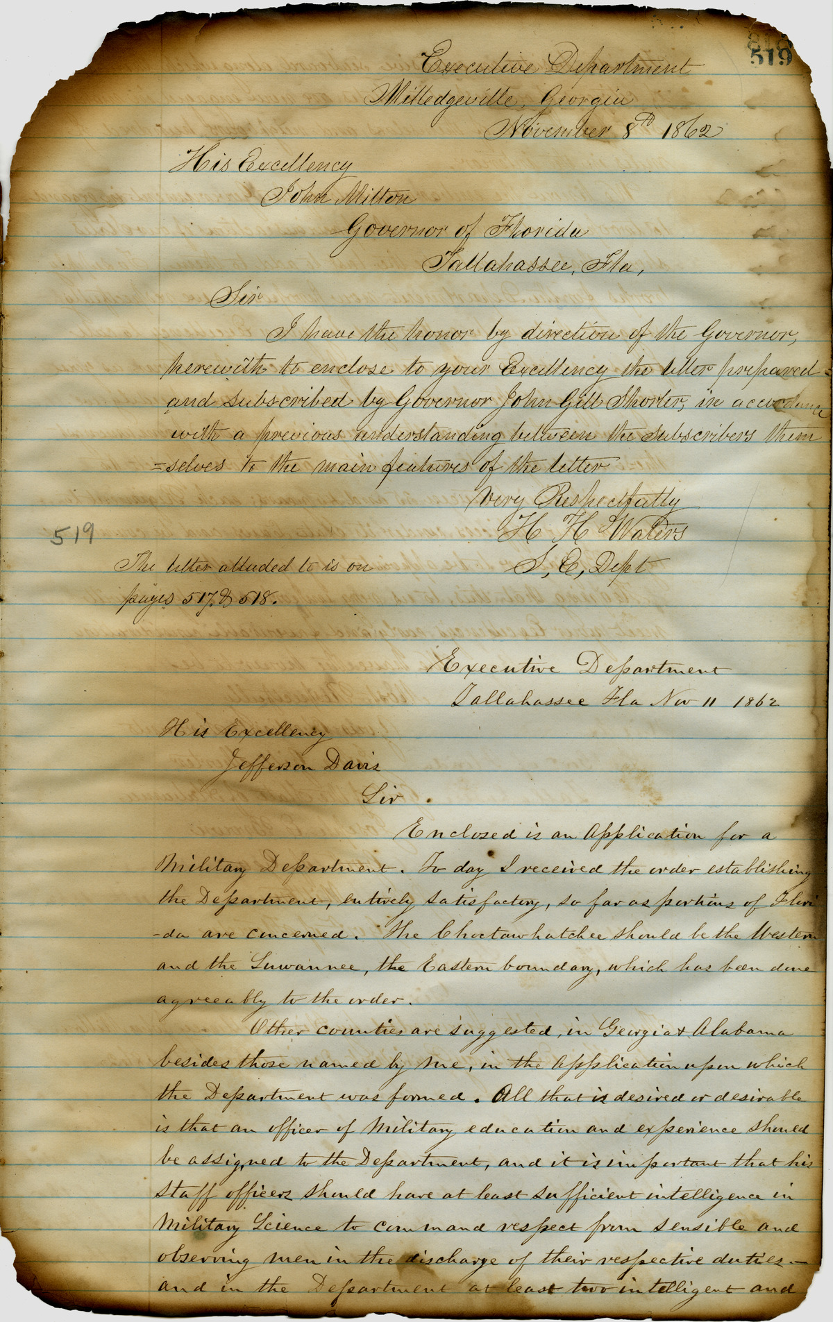 Office of the Governor of Florida. Milton Letterbook: November 8, 1862. 1862-11-11. State Archives of Florida, Florida Memory. Accessed 27 Nov. 2025.<https://www.floridamemory.com/items/show/266125>