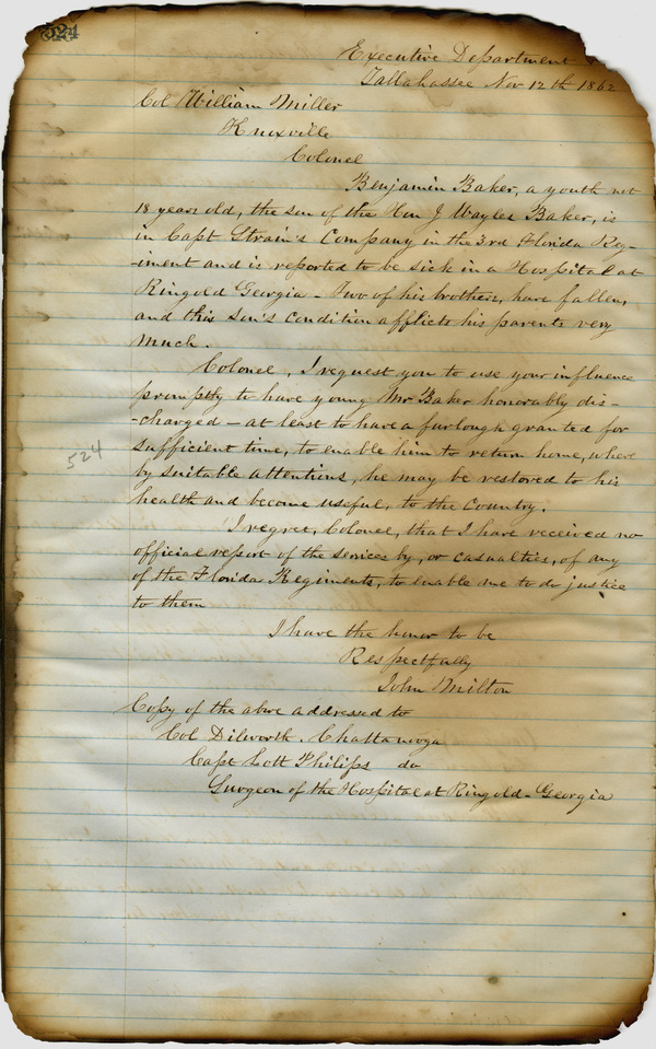 Office of the Governor of Florida. Milton Letterbook: November 12, 1862. 1862-11-12. State Archives of Florida, Florida Memory. <https://www.floridamemory.com/items/show/266130>, accessed 27 November 2025.