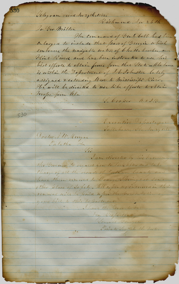 Office of the Governor of Florida. Milton Letterbook: November 26, 1862. 1862-11-27. State Archives of Florida, Florida Memory. Accessed 27 Nov. 2025.<https://www.floridamemory.com/items/show/266136>