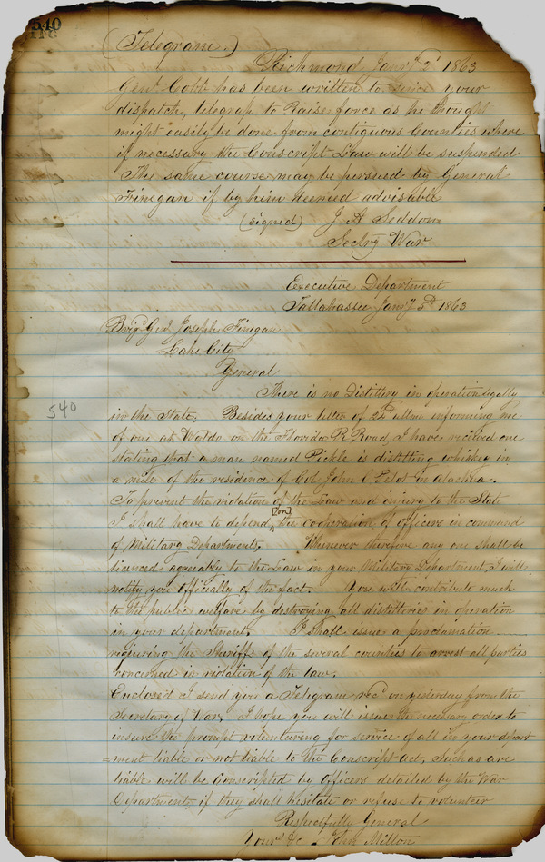 Office of the Governor of Florida. Milton Letterbook: January 2, 1863. 1863-01-05. State Archives of Florida, Florida Memory. <https://www.floridamemory.com/items/show/266146>, accessed 26 November 2025.