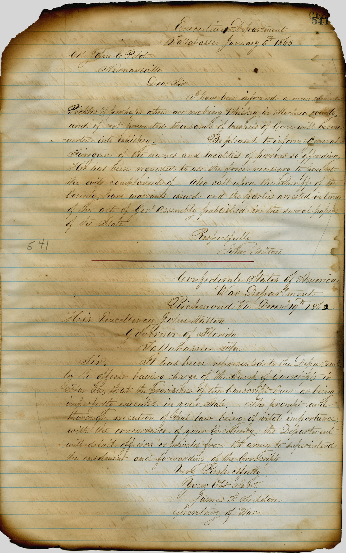 Office of the Governor of Florida. Milton Letterbook: January 5, 1863. 1862-12-19. State Archives of Florida, Florida Memory. <https://www.floridamemory.com/items/show/266147>, accessed 26 November 2025.