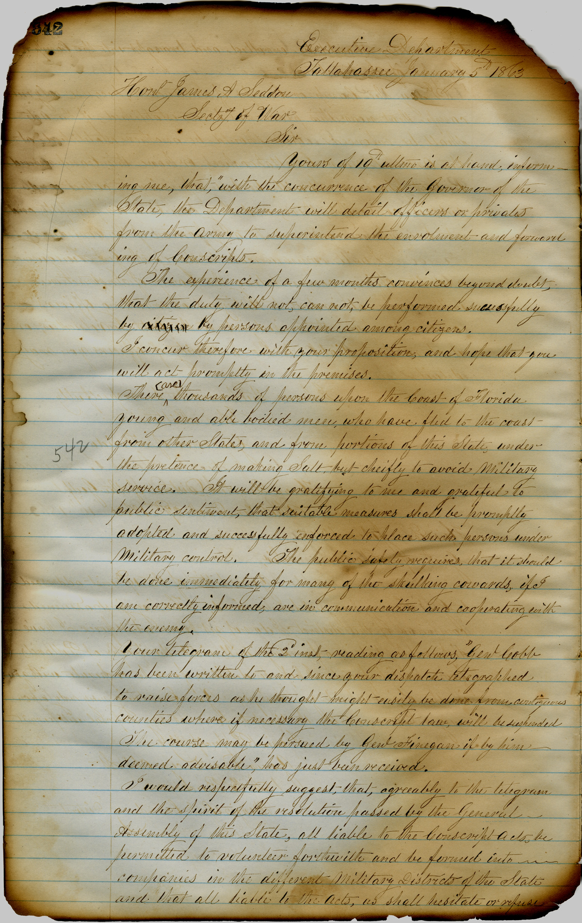 Office of the Governor of Florida. Milton Letterbook: January 5, 1863. 1863-01-05. State Archives of Florida, Florida Memory. <https://www.floridamemory.com/items/show/266148>, accessed 26 November 2025.