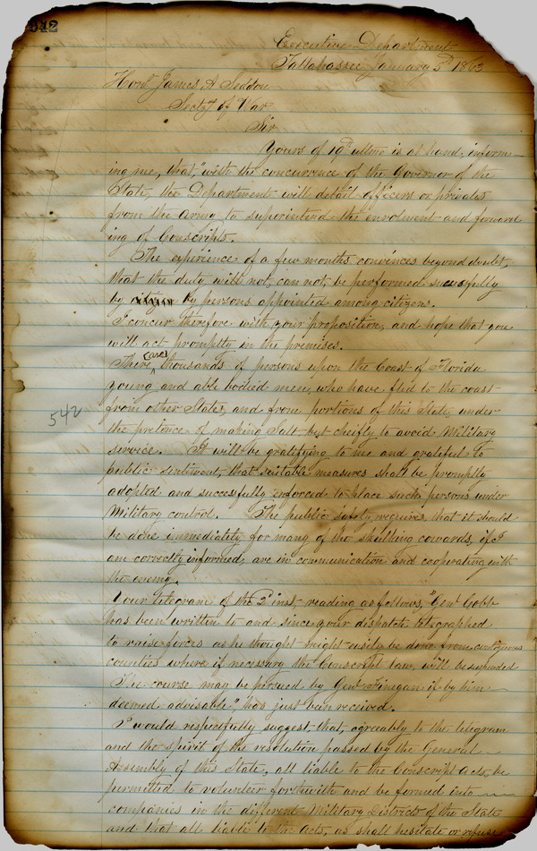 Office of the Governor of Florida. Milton Letterbook: January 5, 1863. 1863-01-05. State Archives of Florida, Florida Memory. Accessed 26 Nov. 2025.<https://www.floridamemory.com/items/show/266148>