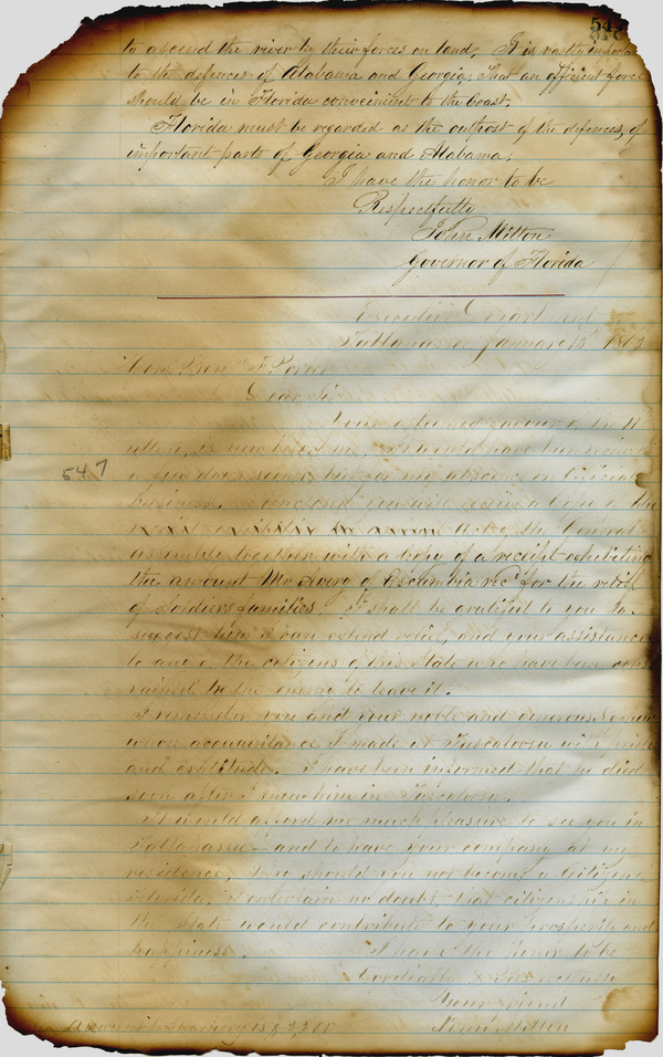 Office of the Governor of Florida. Milton Letterbook: January 10, 1863. 1863-01-13. State Archives of Florida, Florida Memory. Accessed 26 Nov. 2025.<https://www.floridamemory.com/items/show/266153>
