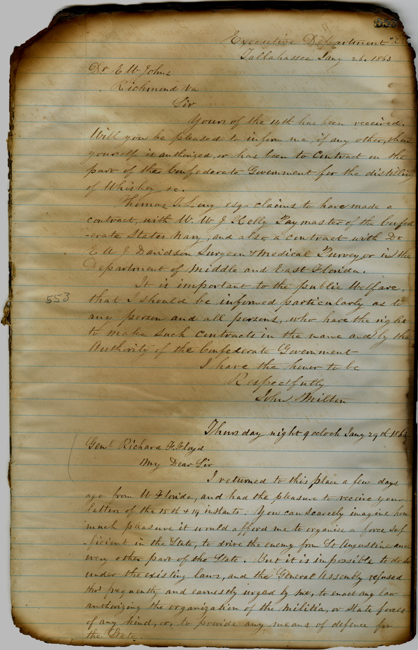 Office of the Governor of Florida. Milton Letterbook: January 26, 1863. 1863-01-29. State Archives of Florida, Florida Memory. Accessed 26 Nov. 2025.<https://www.floridamemory.com/items/show/266159>