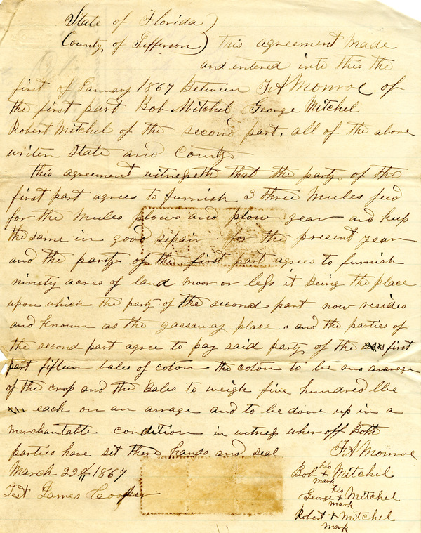 State of Florida County of Jefferson This agreement made and entered into this, the first of January 1867, between F. A. Monroe, of the first part, [and] Bob Mitchel, George Mitchel, Robert Mitchel, of the second part, all of the above written state and county. This agreement witnesseth that the party of the first part agrees to furnish (3) three mules feed for the mules plows and plow gear and keep the same in good repair for the present year and the party of the first part agrees to furnish ninety acres of land, more or less, it being the place upon which the party of the second part now resides and known as the Gassaway place. And, the parties of the second part agree to pay said party of the first part fifteen bales of [cotton]. The [cotton] to be an average of the crop and the bales to weigh five hundred lbs each on an average and to be done up in a merchantable condition. In witness [whereof] both parties have set [their] hands and seal March 22, 1867. [Attest] James Cooper F.A. Monroe Bob Mitchel [his X mark] George Mitchel [his X mark] Robert Mitchel [his X mark]