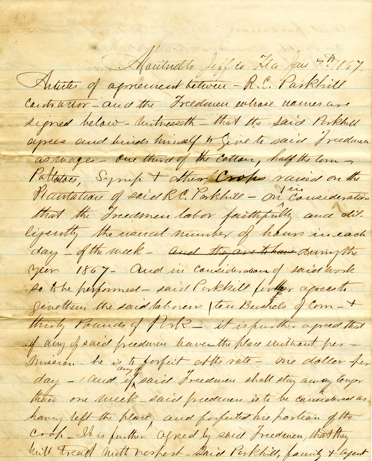 Monticello, Jefferson County, Florida, January 7, 1867 Articles of agreement between R. C. Parkhill, contractor, and the Freedmen whose names are signed below, witnesseth that the said Parkhill agrees and binds himself to give to said Freedmen as wages, one-third of the cotton,half the corn, potatoes, syrup and other crops raised on the plantation of said R. C. Parkhill on the consideration that the Freedmen labor faithfully and diligently the usual number of hours in each day of the week during the year 1867, and in consideration of said work so to be performed, said Parkhill further agrees to give them, the said laborers, ten bushels of corn and thirty pounds of pork. It is further agreed that if any of said Freedmen leave the place without permission, he is to forfeit at the rate [of] one dollar per day, and if any of said Freedmen shall stay away longer than one week, said Freedmen is to be considered as having left the place and forfeited his portion of the crop. It is further agreed by said Freedmen that they will treat with respect said Parkhill, family, and agent