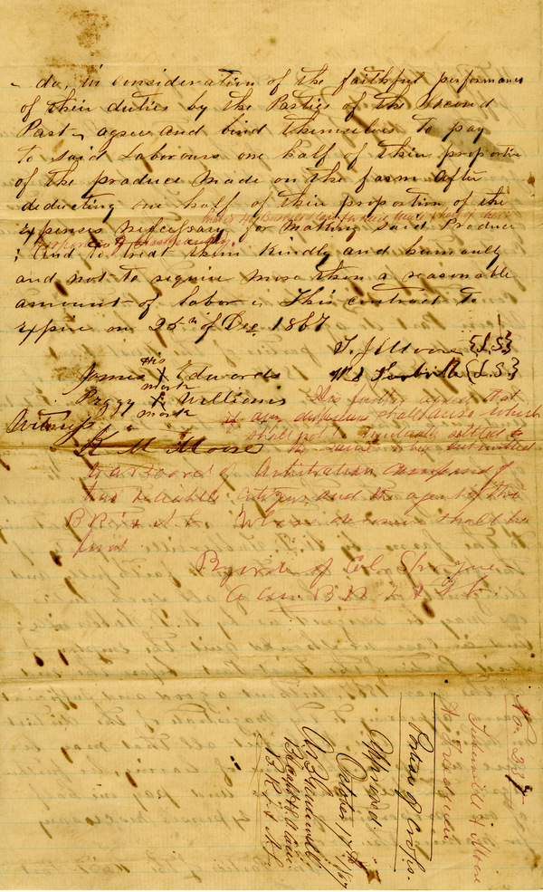 State of Florida Jefferson County Articles of agreement made and entered into this day of Jan 1867 between W. D. Tubberville and T. J. Moore parties of the first part and James Edward and Peggy Williams, [laborers], parties of the second part witnesses: That said parties of the first and second part have this day bargained, contracted, and agreed with each other for the following purposes and on the following condition viz: Said [laborers], parties of the second party do agree and hereby bind themselves to work for said parties of the first part during the year 1867 on the plantation of Mr. K. M. Moore to cultivate corn, cotton, potatoes,and such other produce as said parties of the first part may wish to cultivate; to do any repairing of fences or horses as necessary to make or gather the crop; and to be governed, supervised, and directed in all matters pertaining to the farm by W. D. Tubberville a party of the first part; and to work faithfully and diligently in discharge of all such duties as may be assigned us by W.D. Tubberville and in case we should quit the employ of said parties of the first part before the end of the year of 1867 without a good and sufficient reason appearing to the magistrate of the district in which we live, to forfeit all that may be due us up to the time of leaving. We further agree to feed ourselves and pay one half of our proportion of the expenses necessary for making the crop. The Parties of the First Part