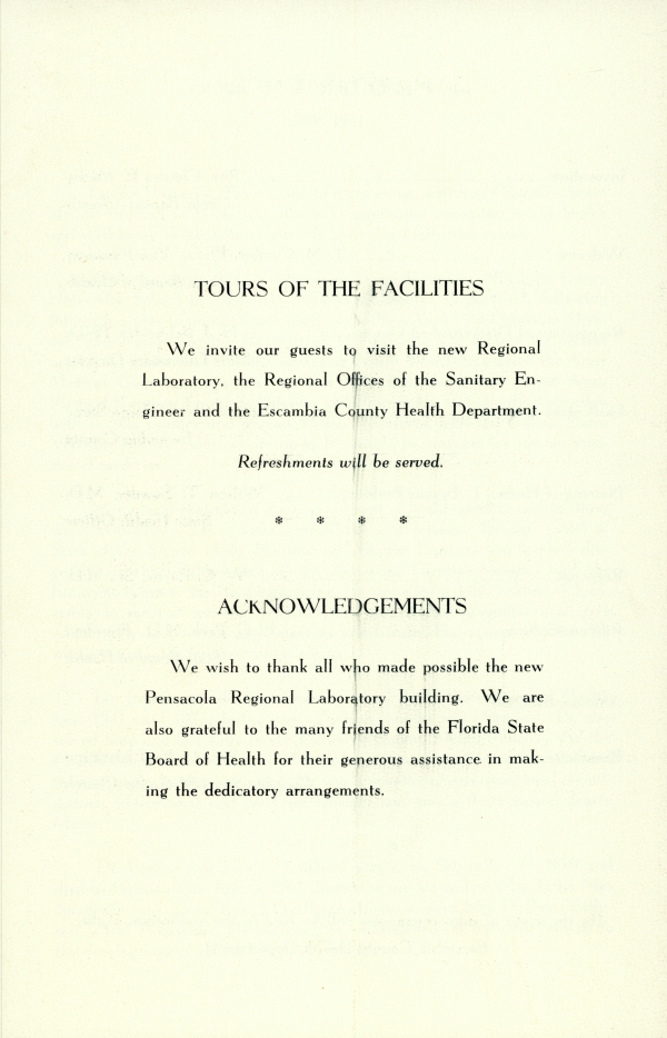 We wish to thank all who made possible the new Pensacola Regional Laboratory building. We are also grateful to the many friends of the Florida State Board of Health for their generous assistance in making the dedicatory arrangements.