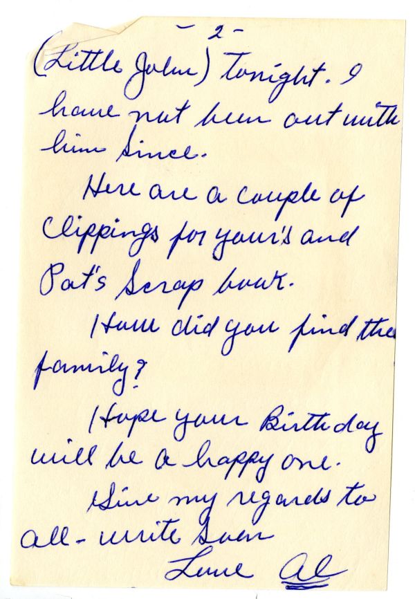 Letter from "Al" to Priscilla Stephens checking in on her and providing clippings for a scrapbook she is making with her sister, Patricia.