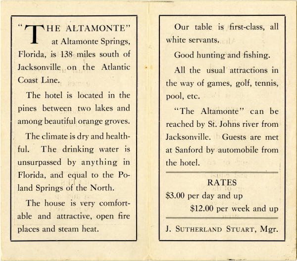 The hotel was built in 1883 by the Altamonte Land, Hotel and Navigation Company. The hotel burned on July 1, 1953. J. Sutherland Stuart owned the Altmonte from 1905-1906 and again in 1909.