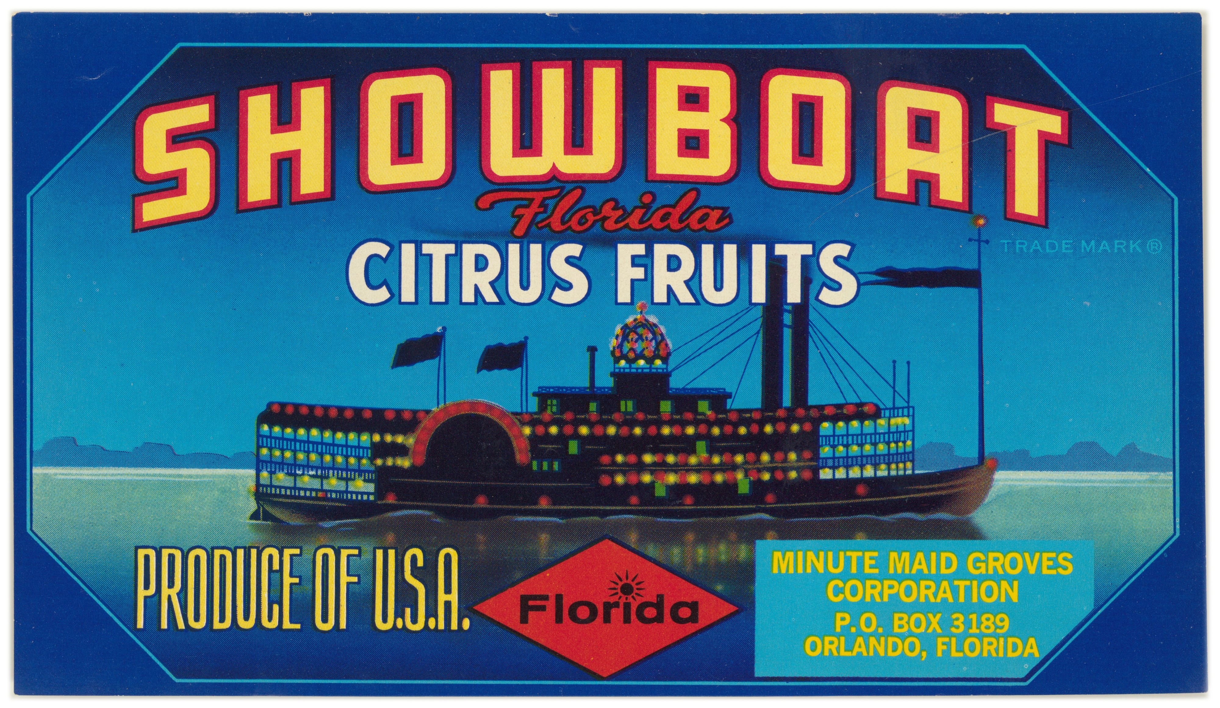 Minute Maid Groves Corporation. Showboat Florida Citrus Fruit Label. 1930 (circa). State Archives of Florida, Florida Memory. Accessed 25 Dec. 2025.<https://www.floridamemory.com/items/show/342691>