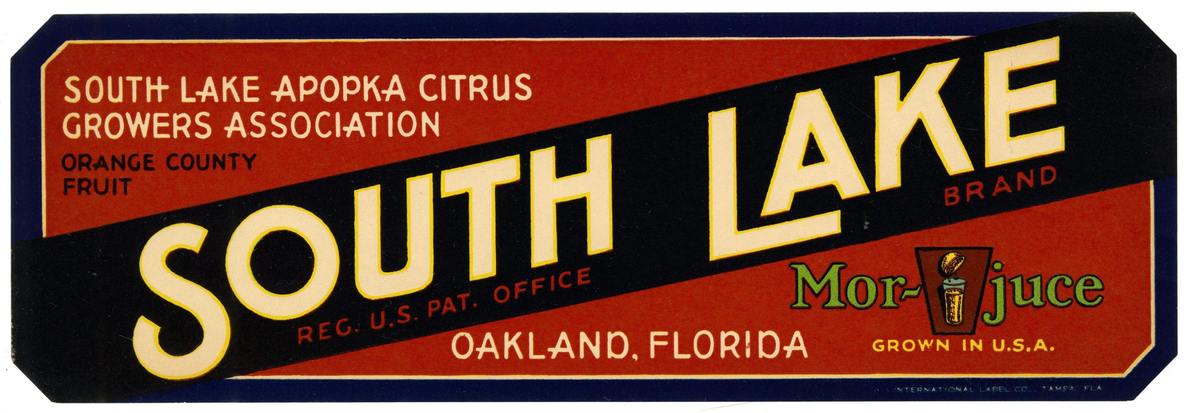 A fruit label for South Lake Brand from South Lake Apopka Citrus Growers Association of Oakland, Florida.