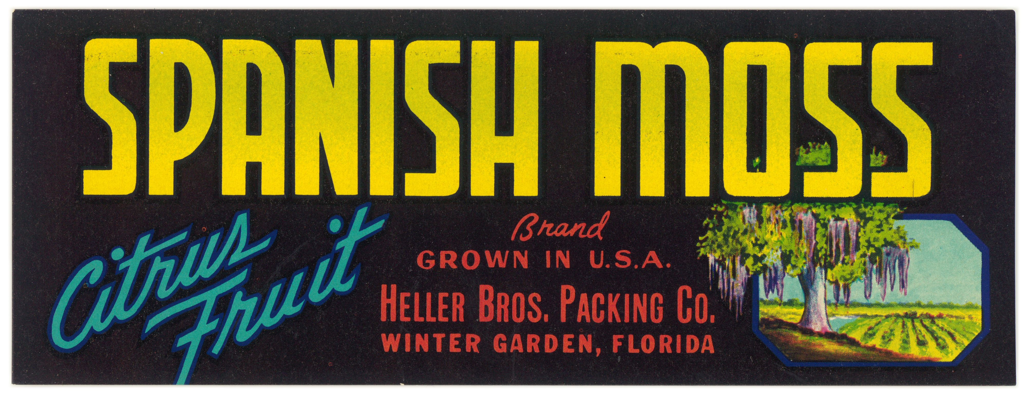 Heller Brothers Packing Company. Spanish Moss Brand Citrus Fruit Label. 1930 (circa). State Archives of Florida, Florida Memory. Accessed 24 Dec. 2025.<https://www.floridamemory.com/items/show/342710>