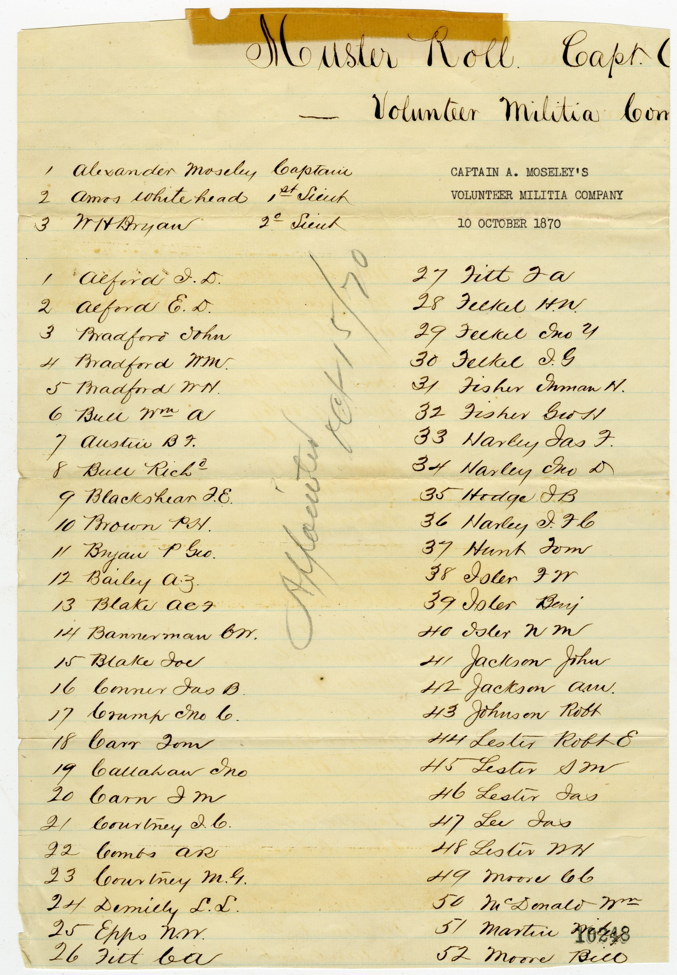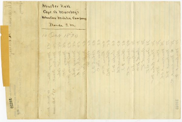Florida. Office of the Adjutant General. Alexander Moseley's Company Muster Roll, Leon County, 1870. October 10, 1870. State Archives of Florida, Florida Memory. Accessed 16 Dec. 2025.<https://www.floridamemory.com/items/show/344623>