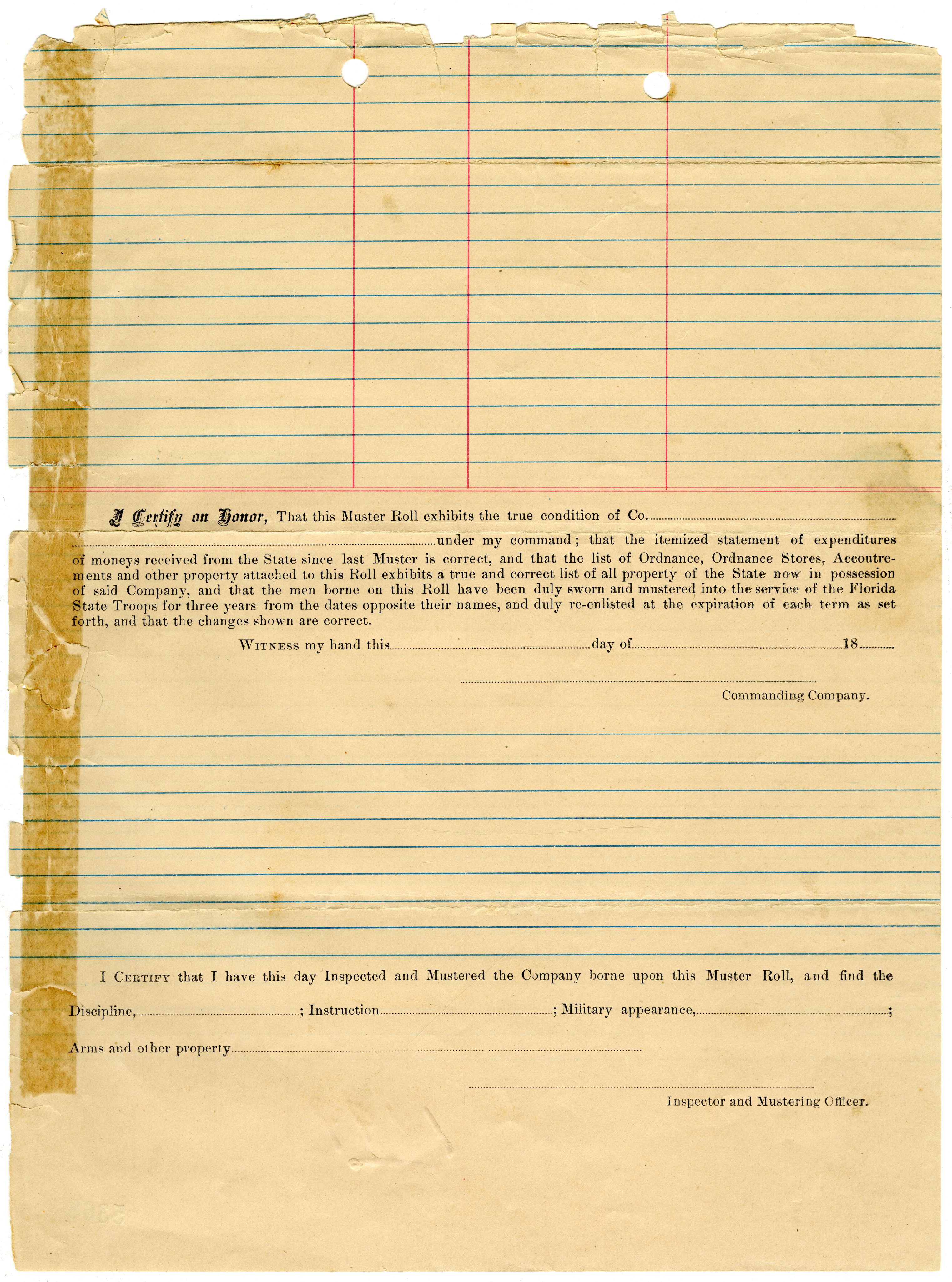Florida. Office of the Adjutant General. Leesburg Rifles Muster Roll, Lake County, 1899. March 18, 1899. State Archives of Florida, Florida Memory. <https://www.floridamemory.com/items/show/344805>, accessed 6 December 2025.