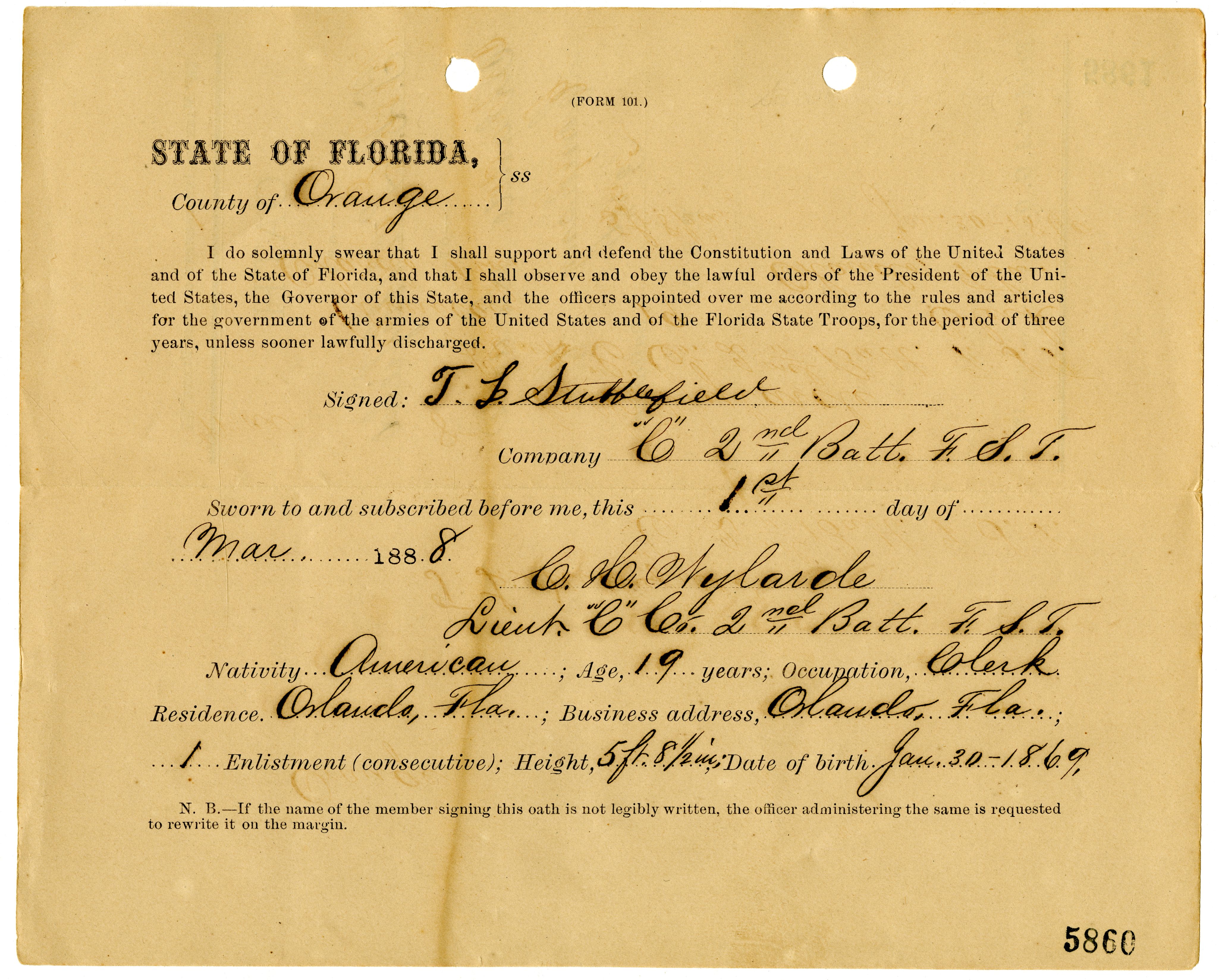 Florida. Office of the Adjutant General. Orlando Guards Oaths, Orange County, 1887. July 12, 1887. State Archives of Florida, Florida Memory. <https://www.floridamemory.com/items/show/344807>, accessed 6 December 2025.