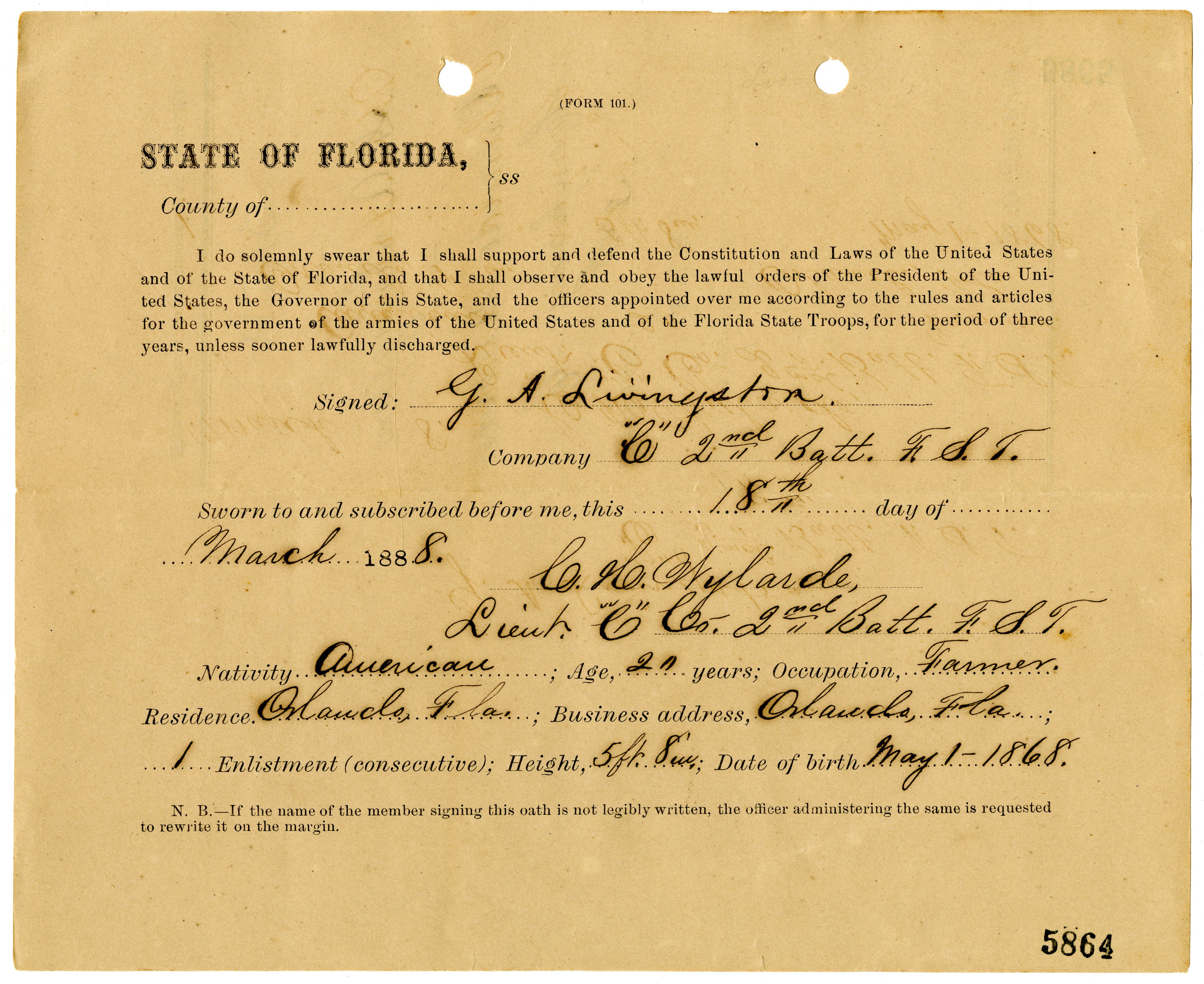 Florida. Office of the Adjutant General. Orlando Guards Oaths, Orange County, 1887. July 12, 1887. State Archives of Florida, Florida Memory. <https://www.floridamemory.com/items/show/344807>, accessed 6 December 2025.