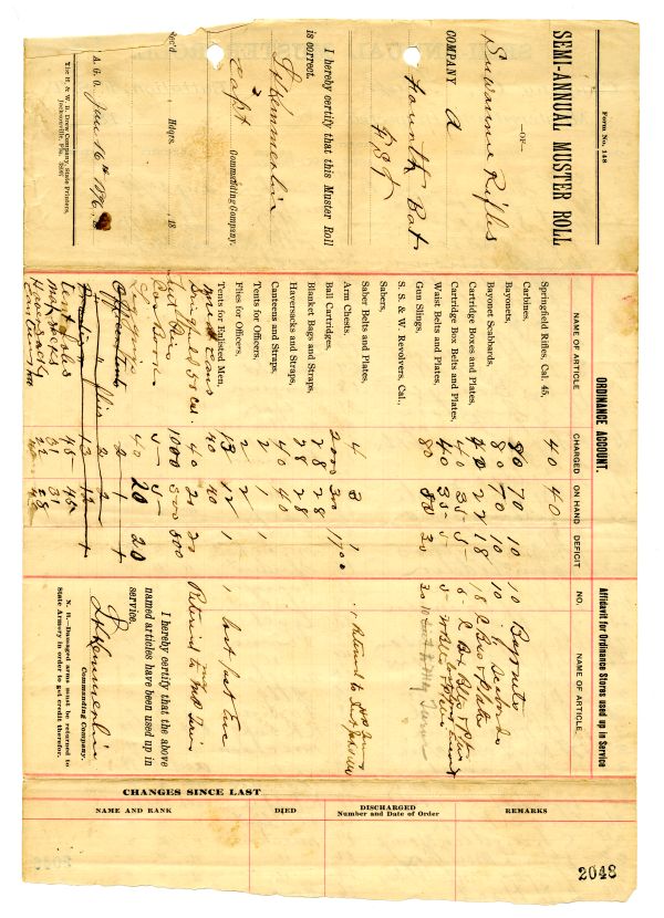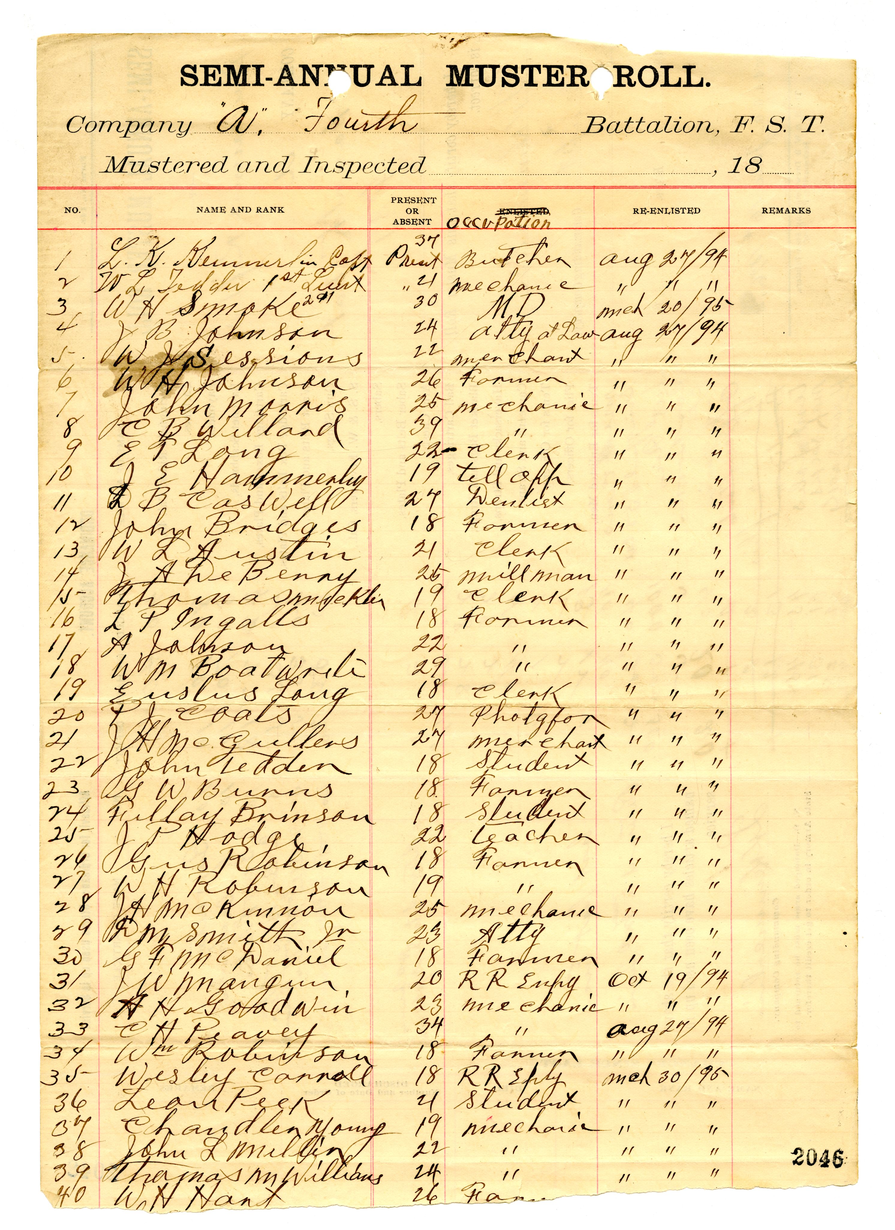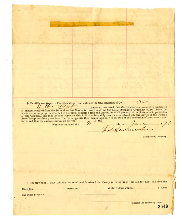 Florida. Office of the Adjutant General. Suwannee Rifles Muster Roll, Suwannee County, 1896. January 2, 1896. State Archives of Florida, Florida Memory. <https://www.floridamemory.com/items/show/344906>, accessed 27 December 2025.