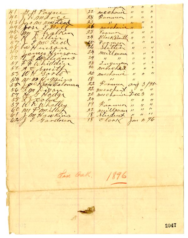 Kemmerlin, L. K. Tedder, W. L. Smoke, W. H. Johnson, J. B. Sessions, W. J. Johnson, W. H. Morris, John Willard, C. B. Long, E. T. Hammerly, J. E. Caswell, D. B. Bridges, John Austin, W. L. DeBerry, J. H. Mickler, Thomas Ingalls, L. P. Johnson, A. Boatwrite, W. M. Long, Eustus Coats, P. J. McCullers, J. H. Tedder, John Burns, G. W. Brinson, Fillay Hodge, J. P. Robinson, Gus Robinson, W. H. McKinnon, J. H. Smith, D. M., Jr. McDaniel, G. F. Mangum, J. W. Goodwin, H. H. Peavey, C. H. Robinson, William Carroll, Wesley Peek, Leon Young, Chandler Millin, John L. Williams, Thomas M. Hart, W. H.