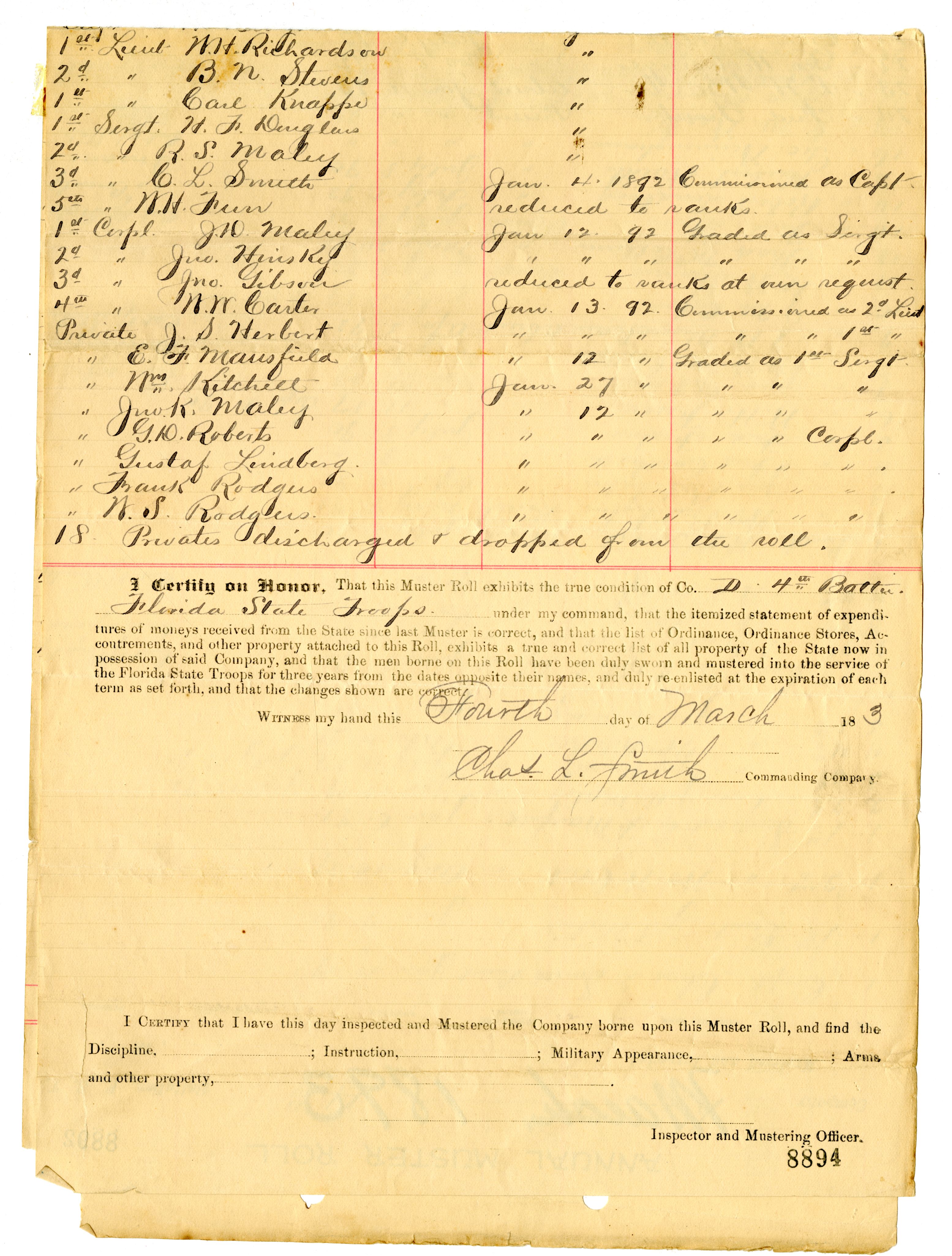 Florida. Office of the Adjutant General. Halifax Rifles Muster Roll, Volusia County, 1893. March 4, 1893. State Archives of Florida, Florida Memory. Accessed 26 Dec. 2025.<https://www.floridamemory.com/items/show/344926>