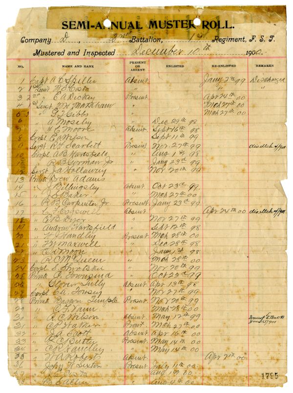 Florida. Office of the Adjutant General. Company D, Second Battalion, First Regiment (Governor's Guards) Muster Roll, Leon County, 1900. December 10, 1900. State Archives of Florida, Florida Memory. <https://www.floridamemory.com/items/show/345022>, accessed 15 December 2025.