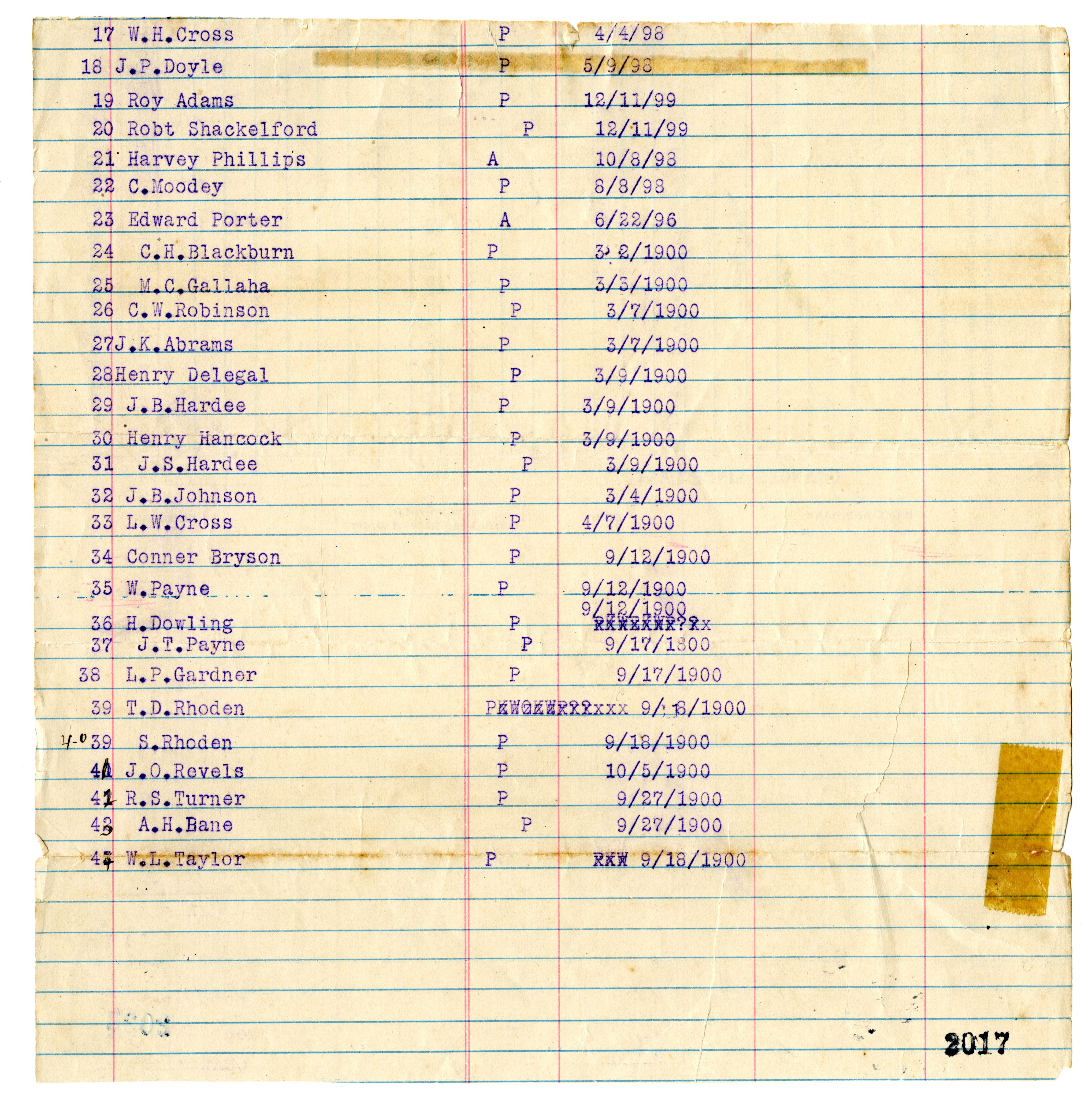 Cross, W. H. Doyle, J. P. Adams, Roy Shackelford, Robert Phillips, Harvey Moodey, C. Porter, Edward Blackburn, C. H. Gallaha, M. C. Robinson, C. W. Abrams, J. K. Delegal, Henry Hardee, J. B. Hancock, Henry Hardee, J. S. Johnson, J. B. Cross, L. W. Bryson, Conner Payne, W. Dowling, H. Payne, J. T. Gardner, L. P. Rhoden, T. D. Rhoden, S. Revels, J. O. Turner, R. S. Bane, A. H. Taylor, W. L.