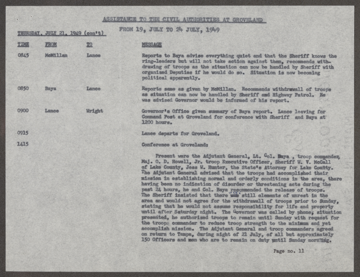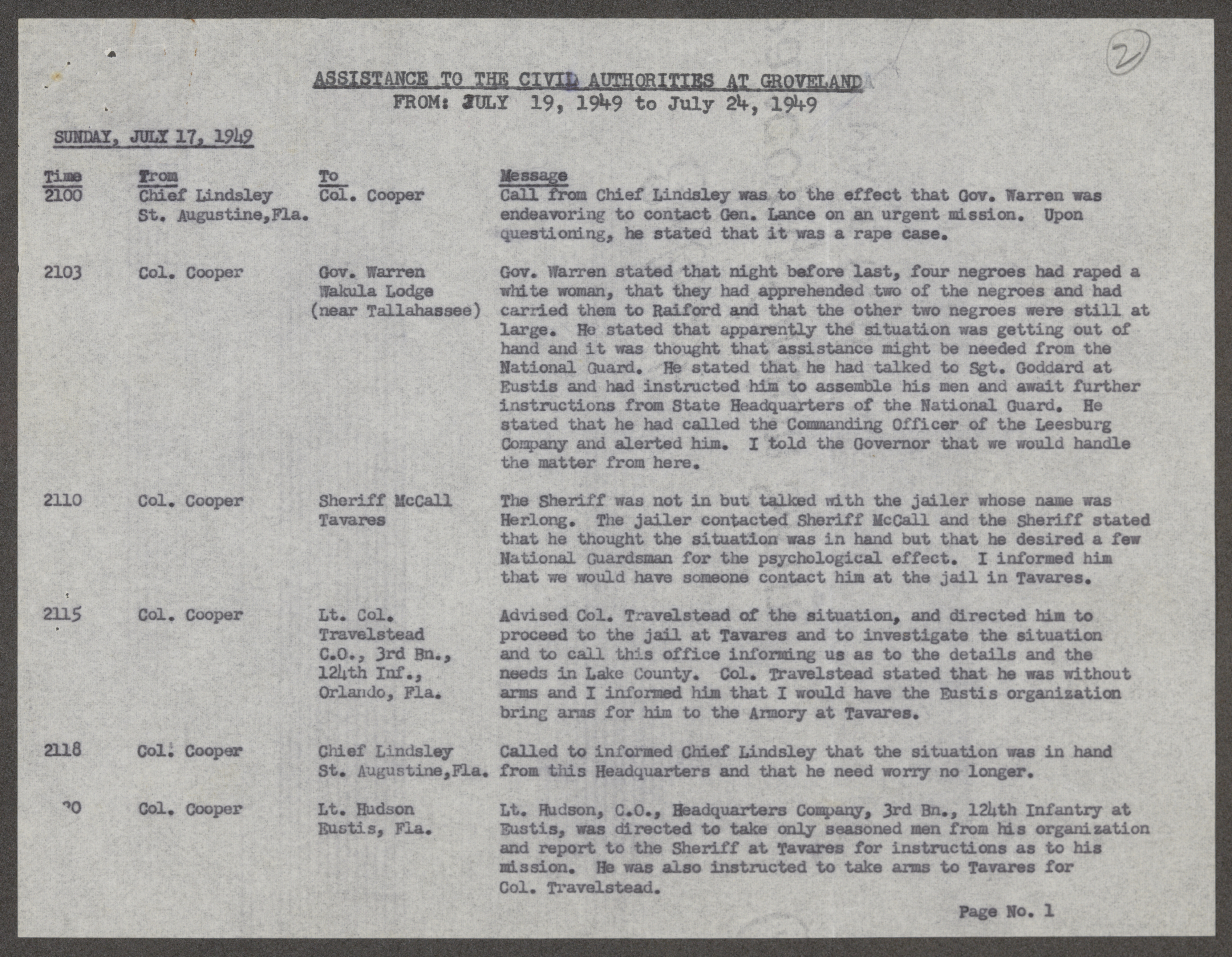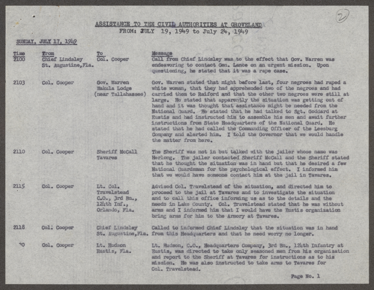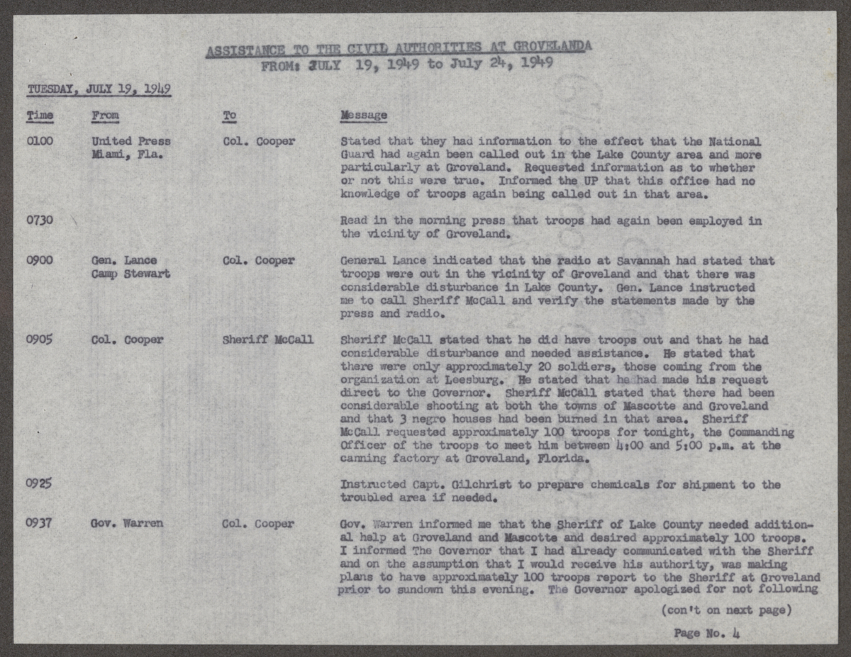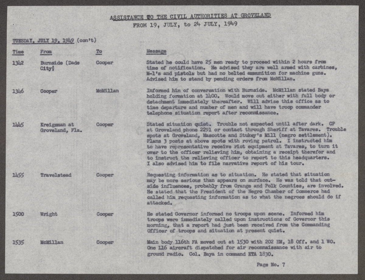 Cooper, Ralph W, 1905-1996. Assistance to the Civil Authorities at Groveland, From July 19, 1949 to July 24, 1949. 1949-07. State Archives of Florida, Florida Memory. <https://www.floridamemory.com/items/show/351220>, accessed 18 November 2025.