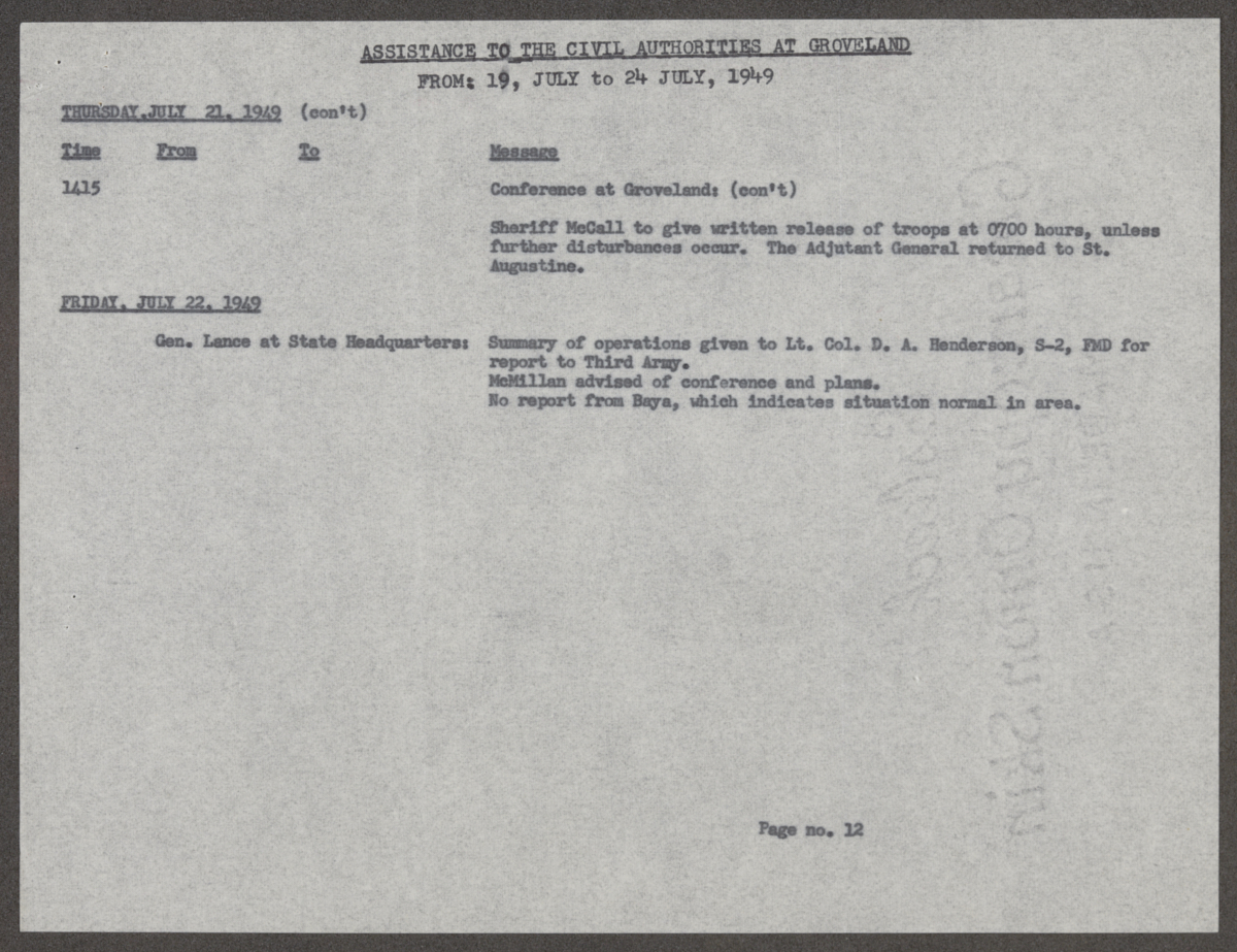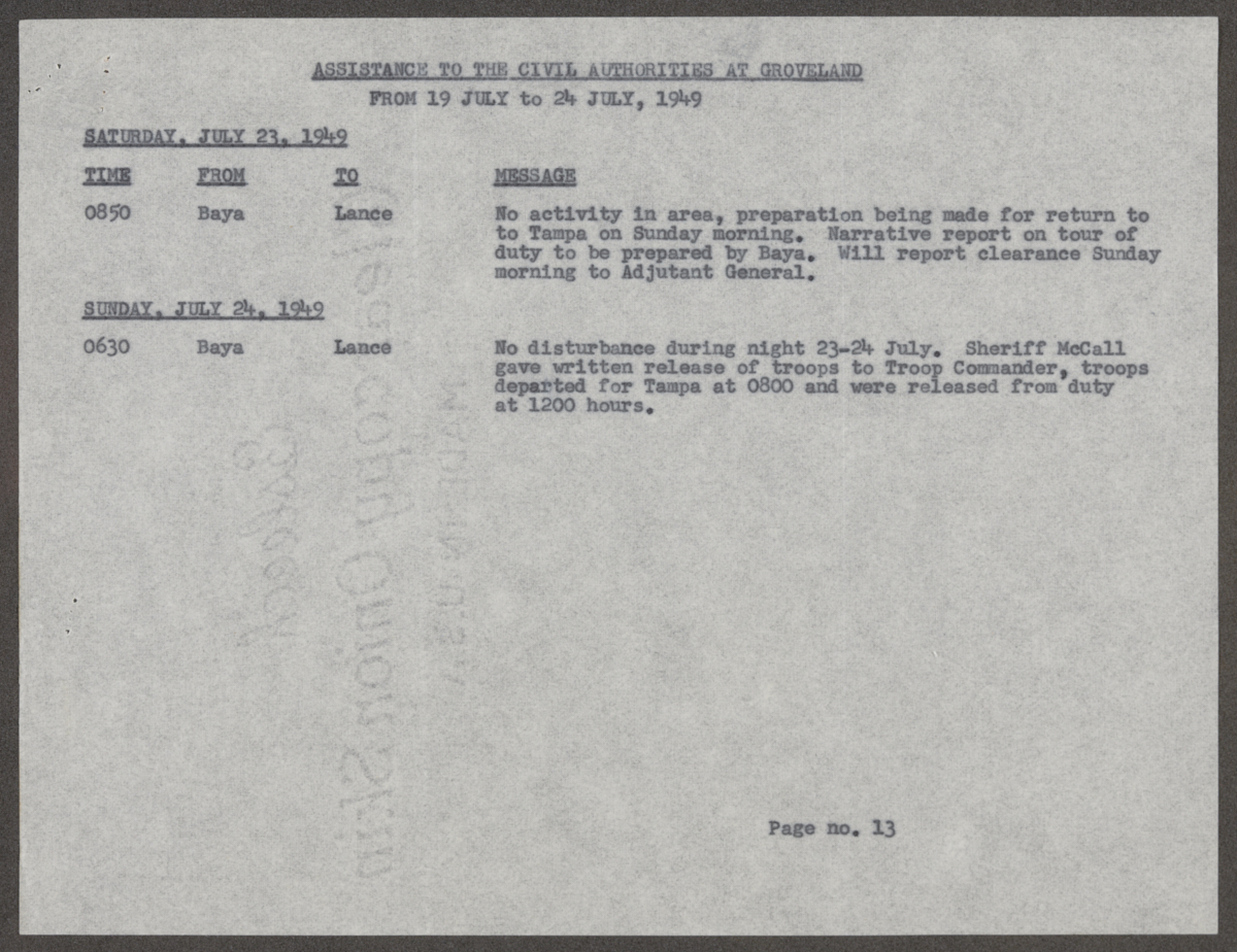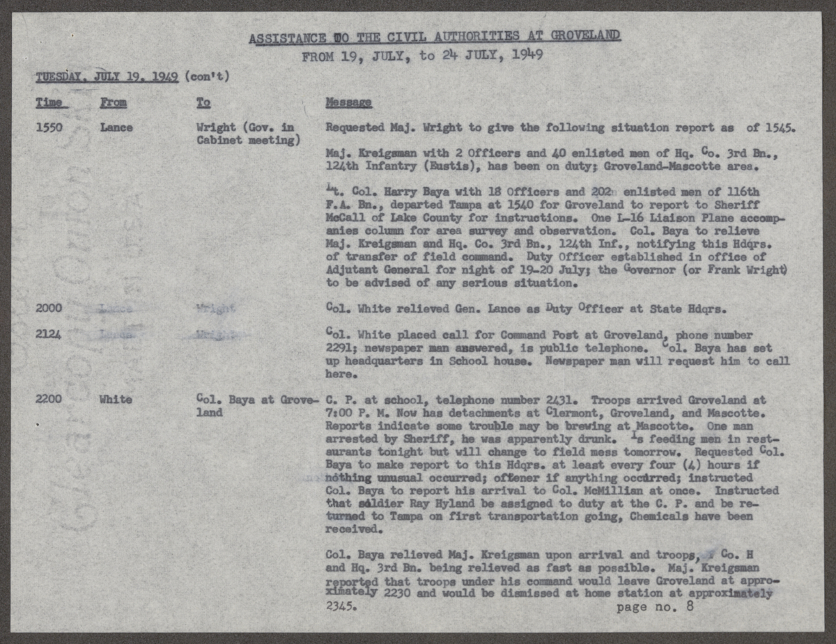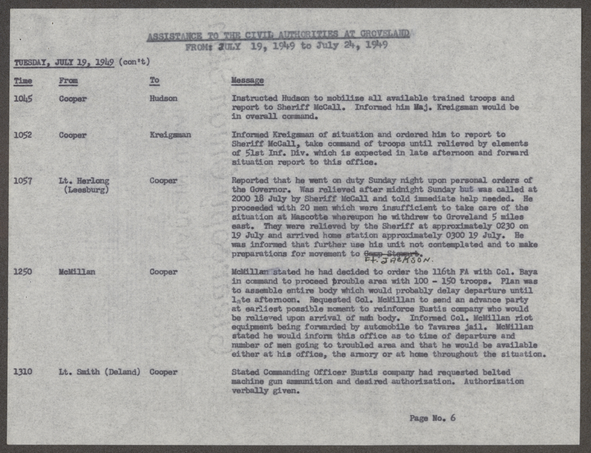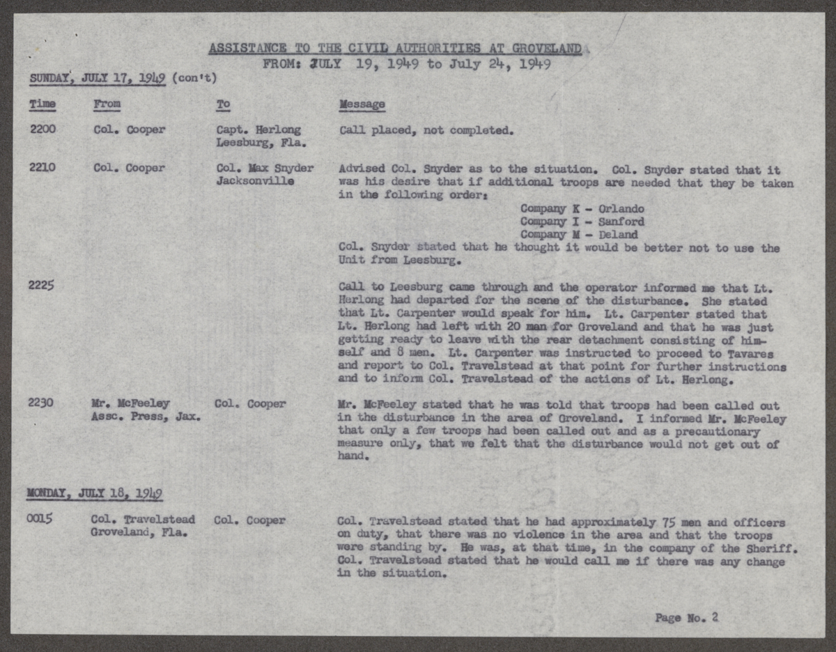 Cooper, Ralph W, 1905-1996. Assistance to the Civil Authorities at Groveland, From July 19, 1949 to July 24, 1949. 1949-07. State Archives of Florida, Florida Memory. Accessed 18 Nov. 2025.<https://www.floridamemory.com/items/show/351220>